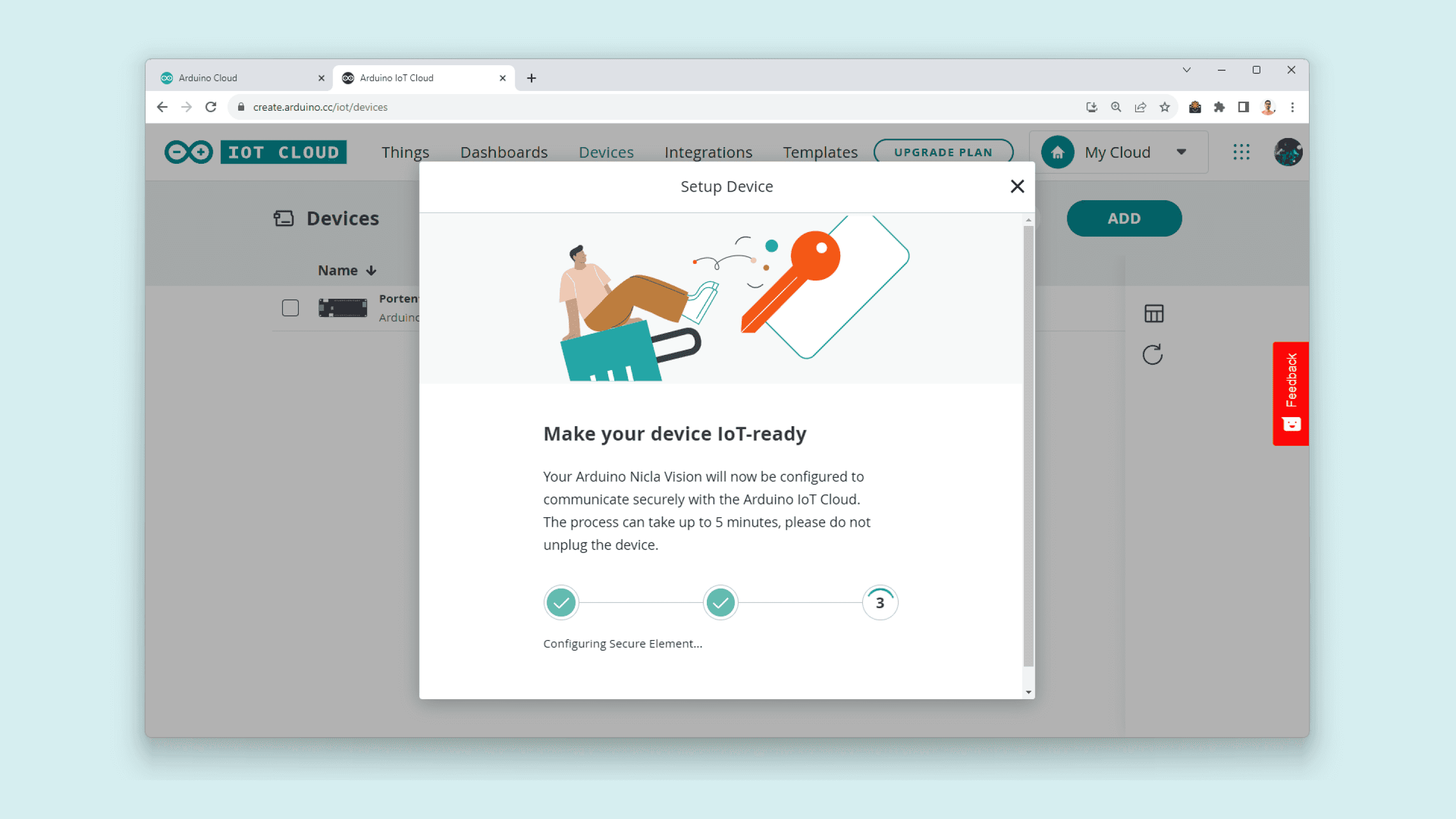 Click the CONFIGURE button, give your device a name, and your Nicla Vision will be configured to communicate securely with the Arduino Cloud; this process can take a while.