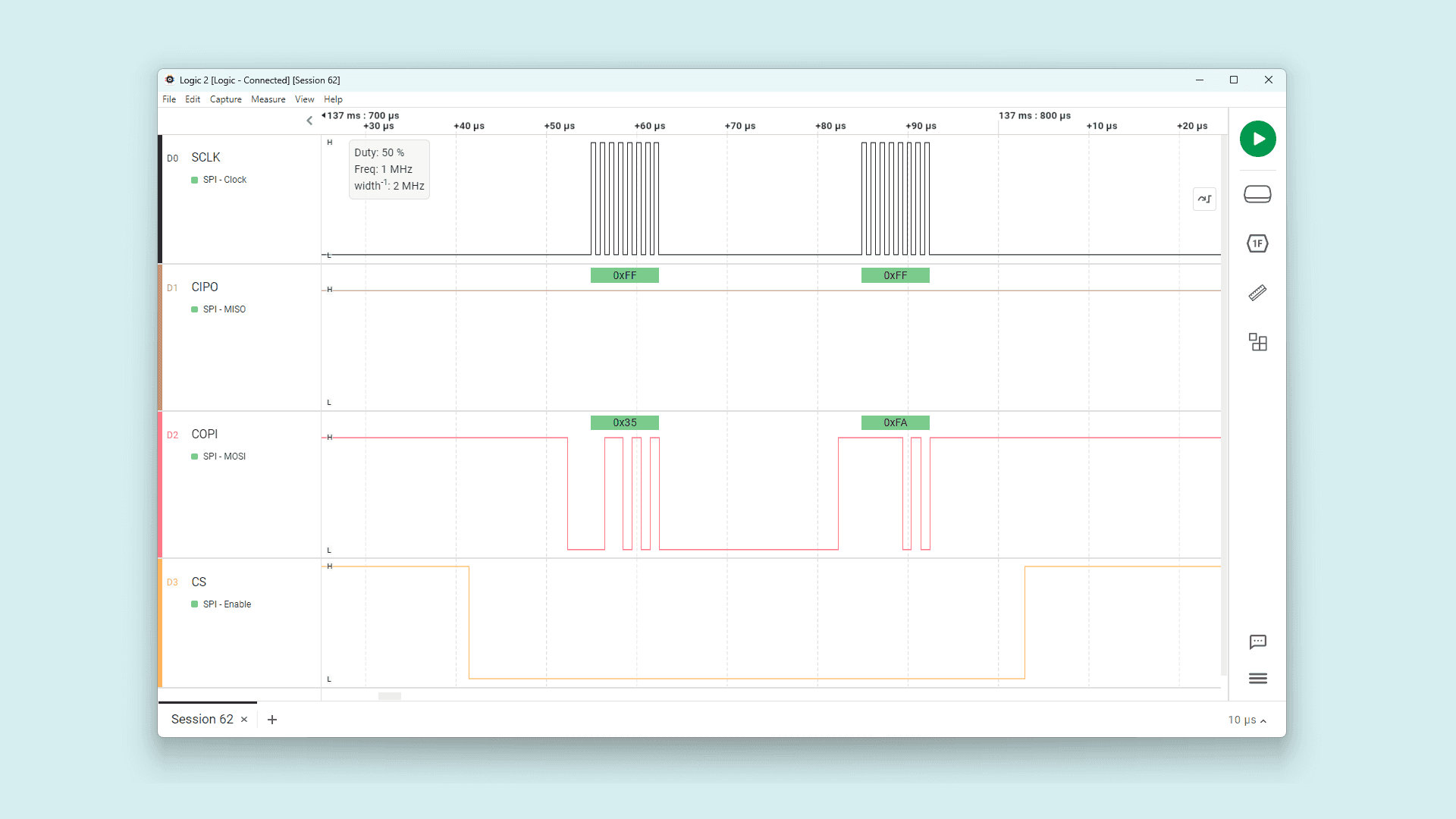 8while True:9 redLED.on()10 time.sleep_ms(1000)11 redLED.off()12 time.sleep_ms(1000)13 greenLED.on()14 time.sleep_ms(1000)15 greenLED.off()16 time.sleep_ms(1000)17 blueLED.on()18 time.sleep_ms(1000)19 blueLED.off()20 time.sleep_ms(1000)To run the code on the Nicla Vision, click the Connect button and then the Start button.