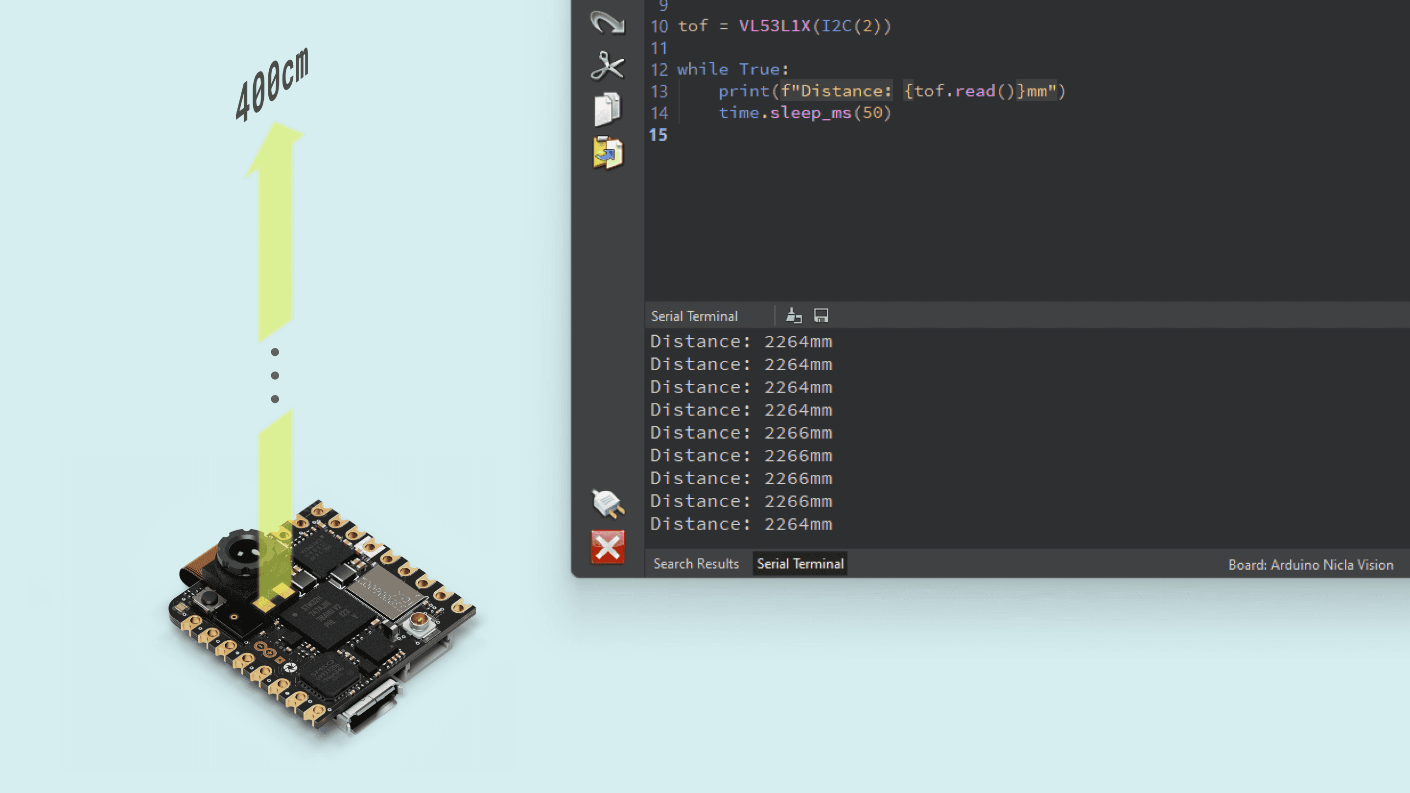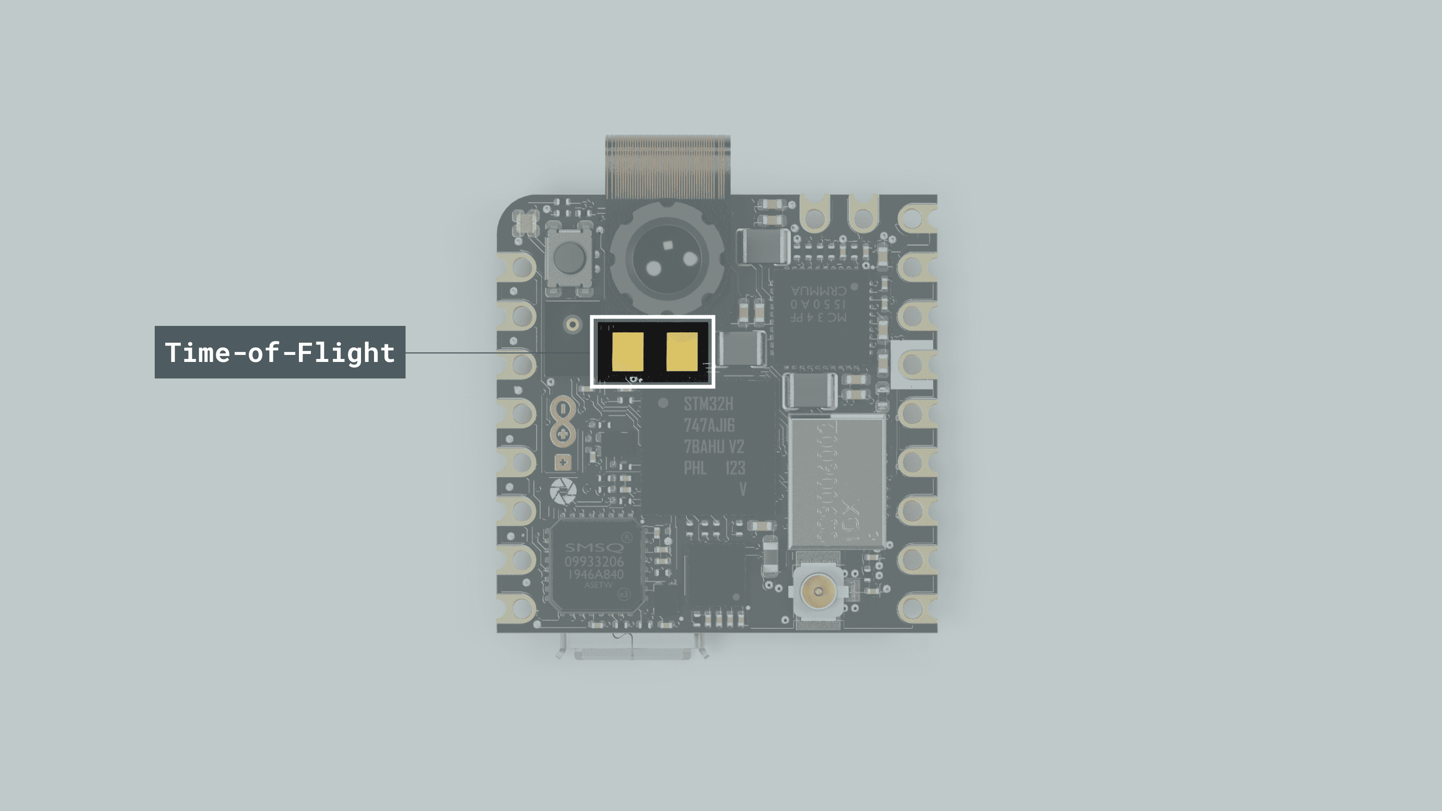 - Onboard distance sensor: the VL53L1CBV0FY Time-of-Flight sensor (U4) adds accurate and low-power ranging capabilities to the Nicla Vision. The invisible near infrared VCSEL laser (including the analog driver) is encapsulated together with receiving optics in an all-in-one small module located below the camera.