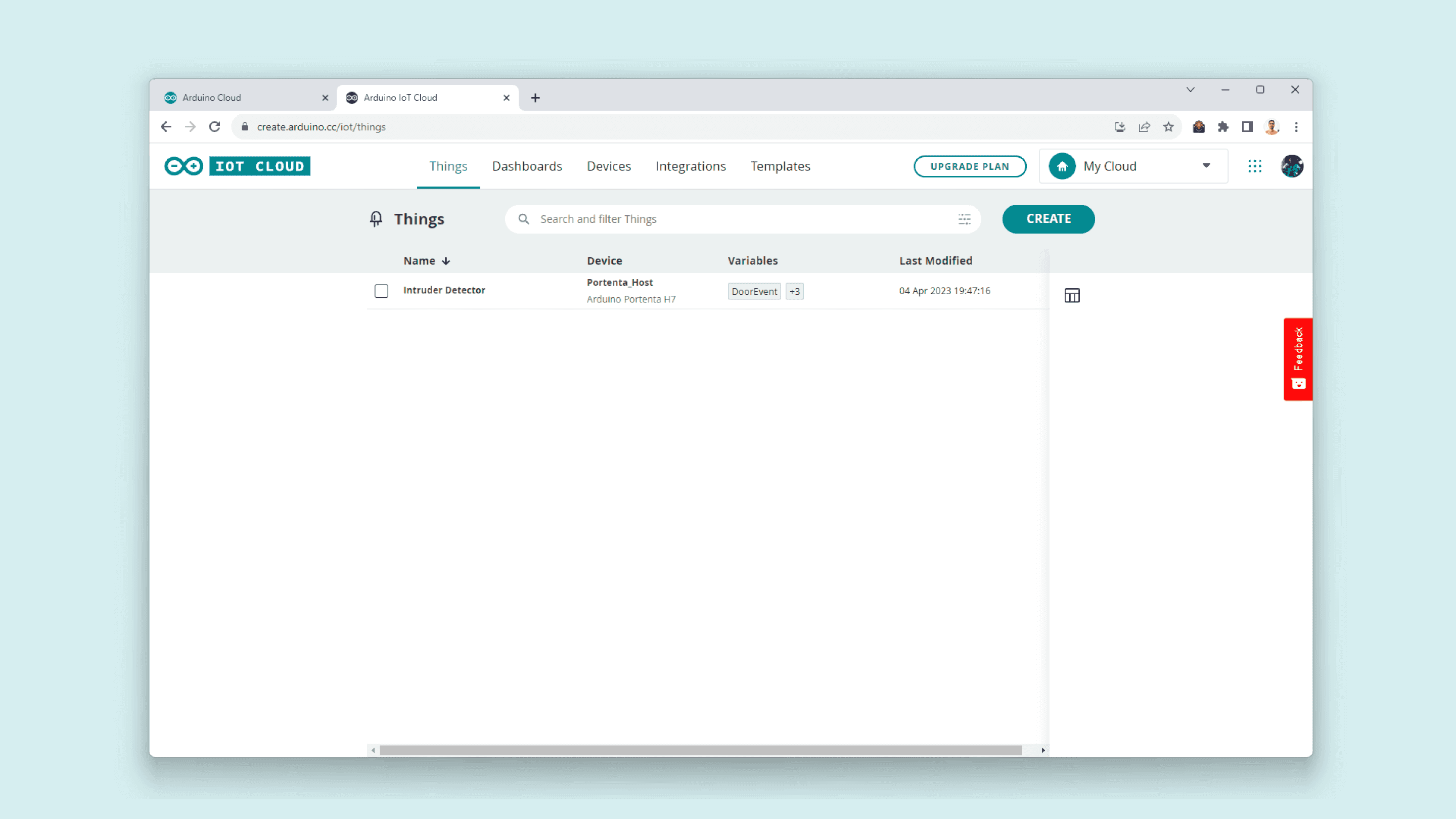 Log in to your Arduino Cloud account; you should see the following (without any "Thing" created):