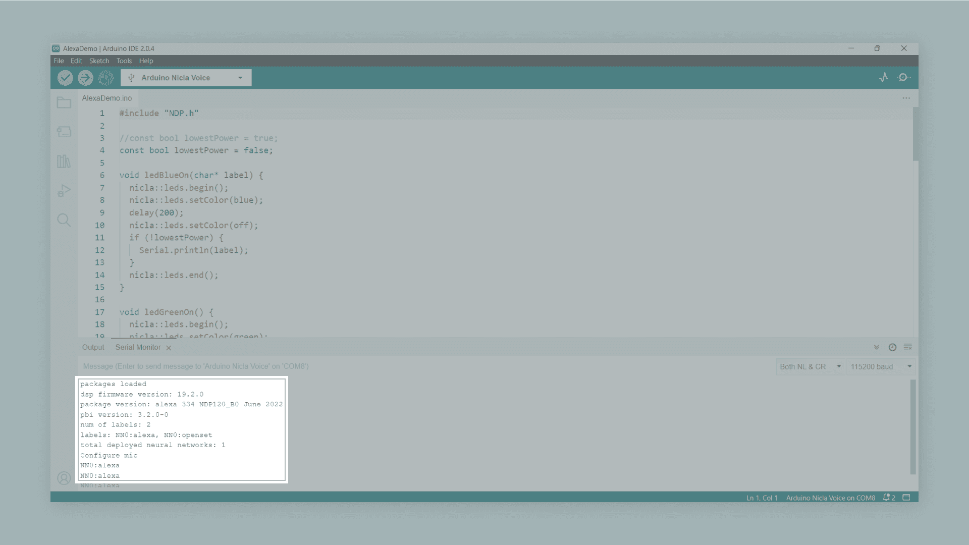 message in the console as shown in the image below.filename sent successfulAfter successfully uploading the three files, we can upload the speech recognition example to the Nicla Voice. The speech recognition example can be found in the board's built-in examples by navigating to File -> Examples -> NDP -> AlexaDemo. To test the example say "Alexa"; this should make the onboard LED of the Nicla Voice blink blue if the word "Alexa" is recognized. If there is no response from the board, try speaking from a closer proximity or louder. You should also see in the Serial Monitor if the word "Alexa" was detected as shown in the image below: