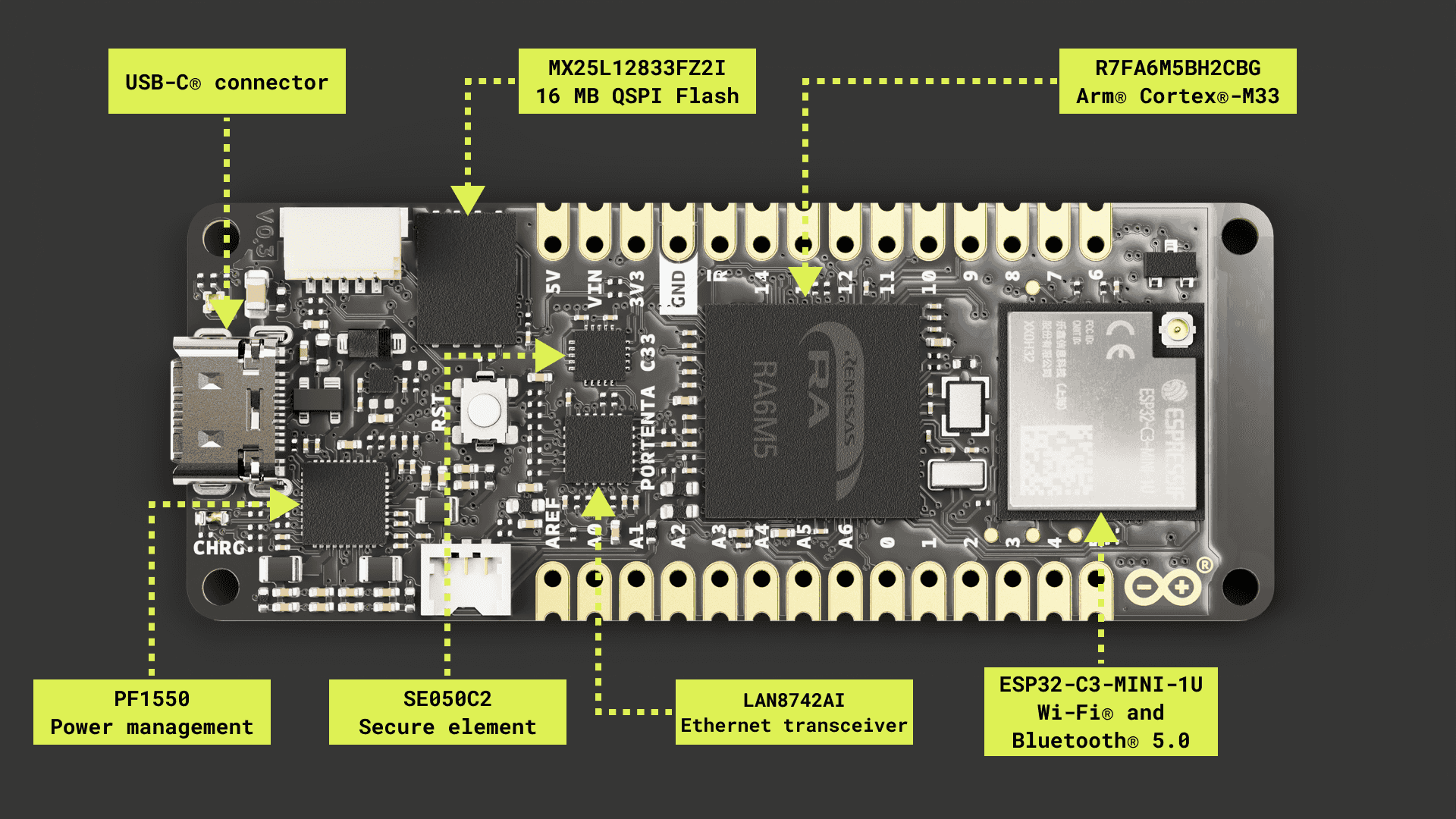 - Microcontroller: At the heart of the Portenta C33 is the R7FA6M5BH2CBG, a powerful and versatile SOM from Renesas®. The R7FA6M5BH2CBG is built around a 32-bit Arm® Cortex®-M33 processor running at 200 MHz, with 2 MB of Flash memory and 512 kB of SRAM.