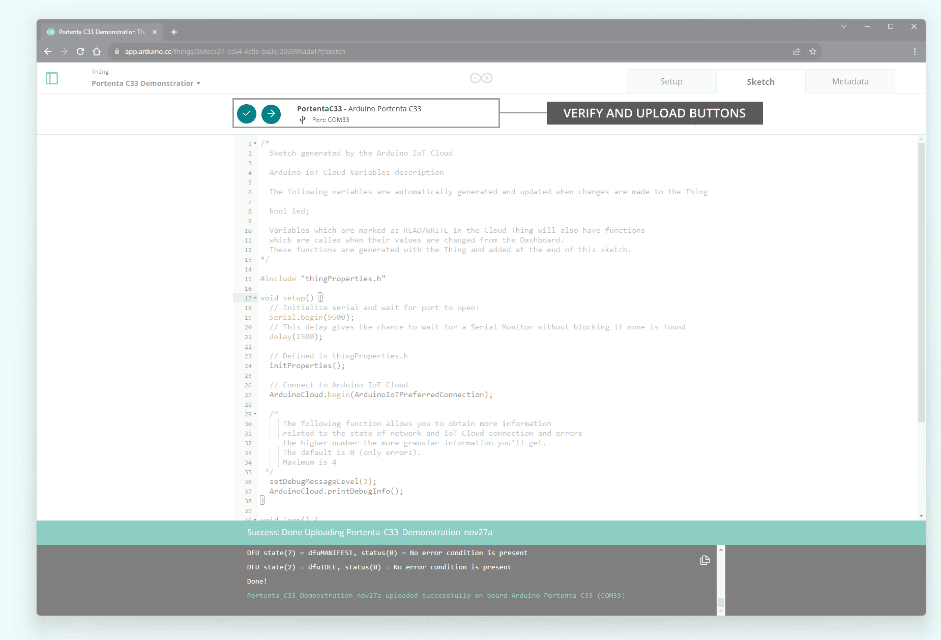 45/*46 Since Led is READ_WRITE variable, onLedChange() is47 executed every time a new value is received from IoT Cloud.48*/49void onLedChange() {50 digitalWrite(LED_BUILTIN, !led);51}To upload the code to the Portenta C33 from the online editor, click the green Verify button to compile the sketch and check for errors, then click the green Upload button to program the board with the sketch.
