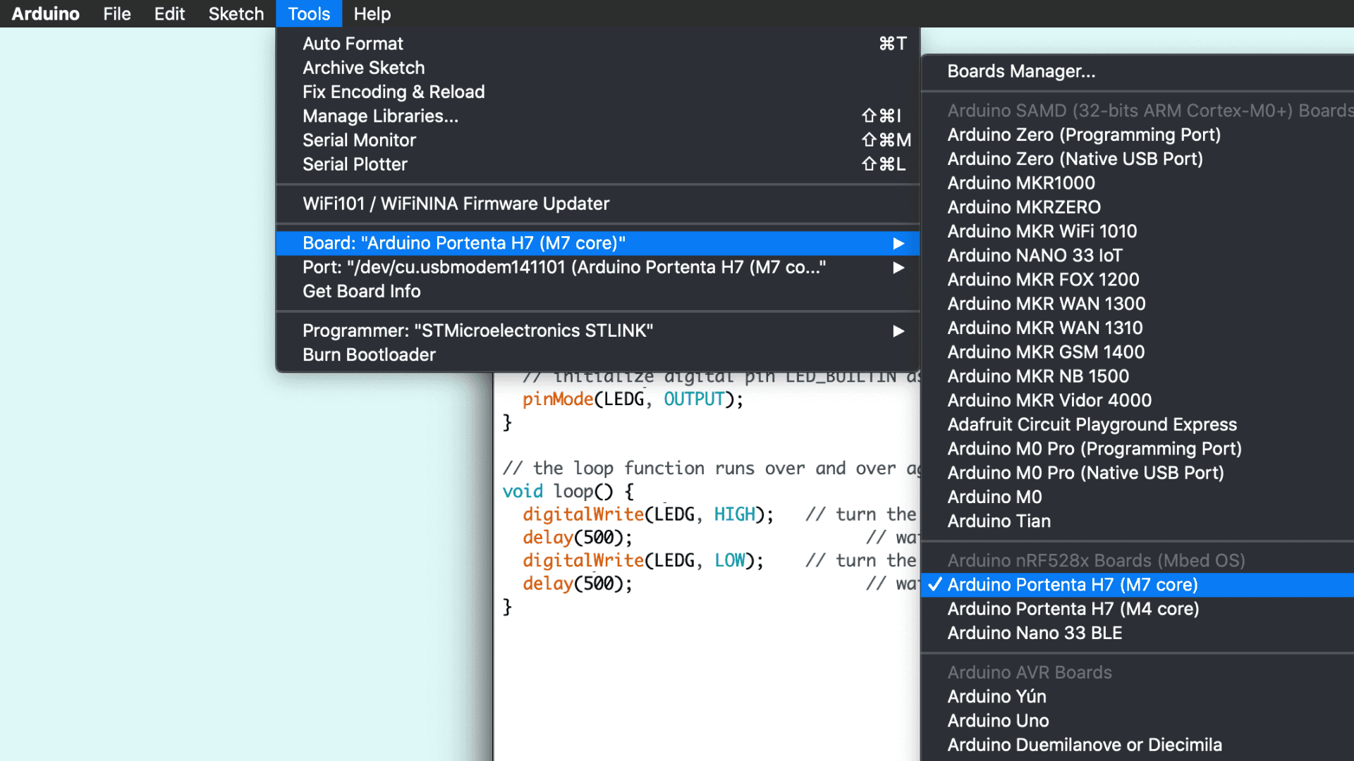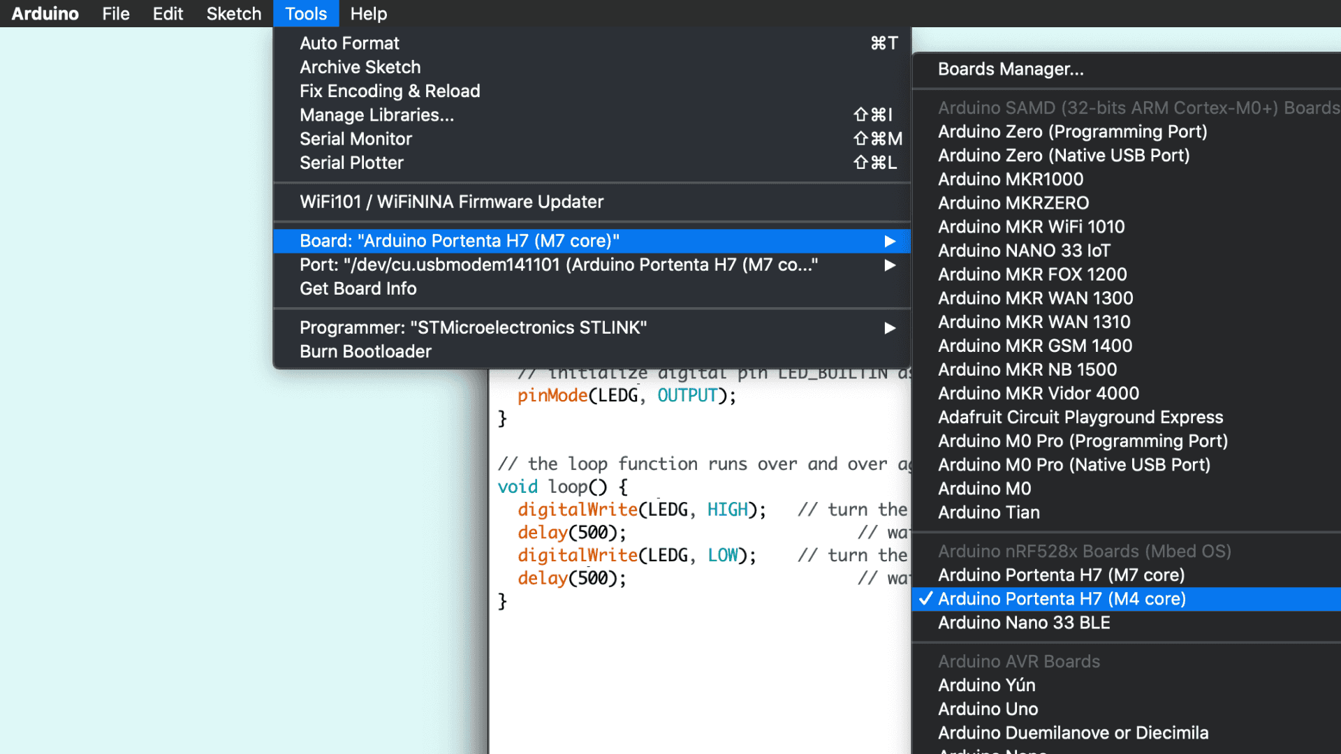 Select the Arduino Portenta H7 (M7 core) from the Board menu and the port the Portenta is connected to (e.g. /dev/cu.usbmodem141101). Upload the BlinkRedLed_M7.ino sketch. Doing so will automatically compile the sketch beforehand. When the sketch is uploaded, the RGB LED on the board will start blinking red.