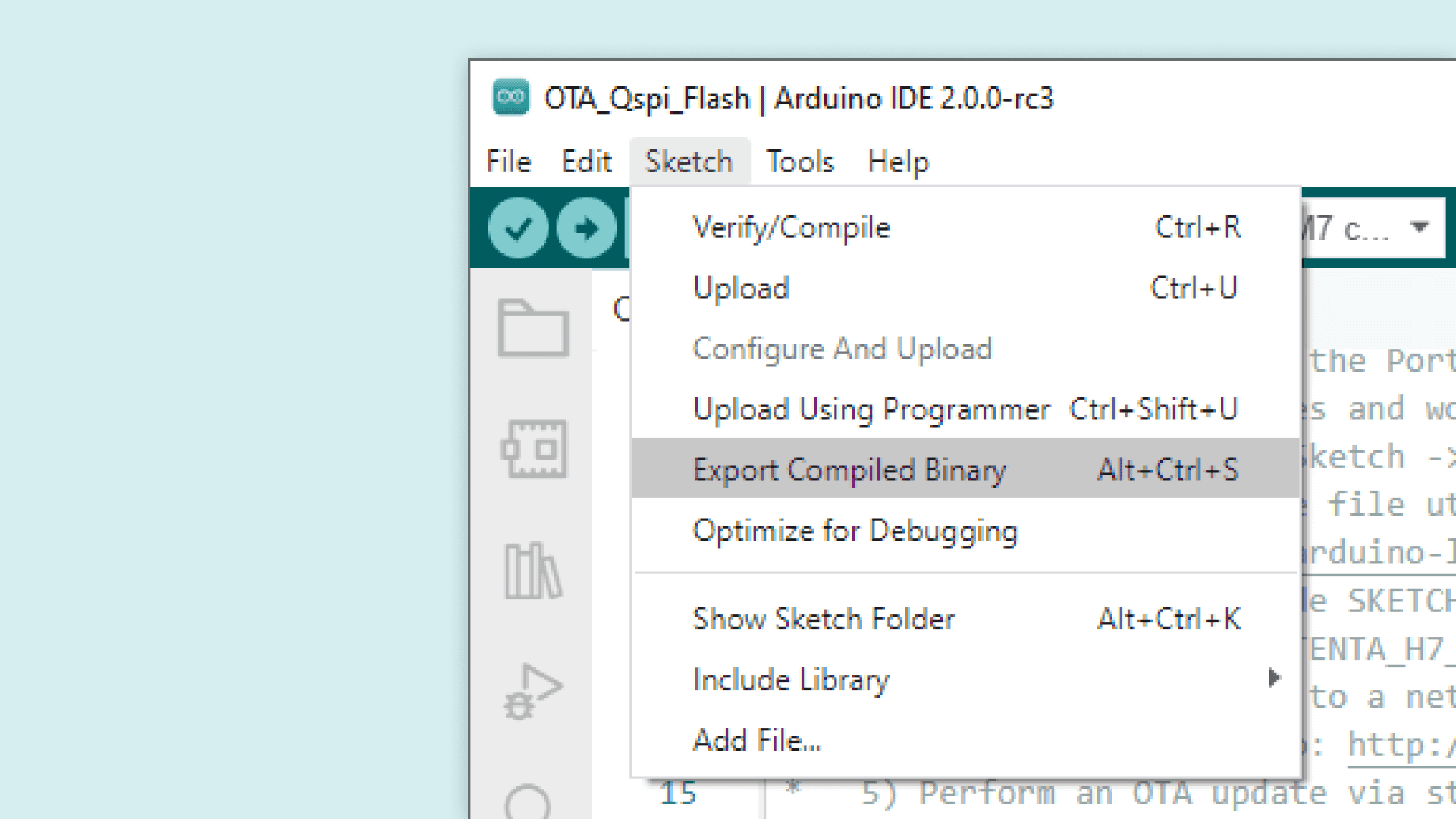 31void loop()32{ //led BLUE ON33 setLed(1, 0, 0);34 delay(1000);35 //led GREEN ON36 setLed(0, 1, 0);37 delay(1000);38 //led RED ON39 setLed(0, 0, 1);40 delay(1000);41}This script will light up the RGB LED with 3 different colors in sequence. This code will need to be uploaded to the Arduino Portenta H7 firsthand. This is to verify whether the sketch compiles and is working correctly. After verifying this, in Arduino IDE, you will search for Sketch > Export Compiled Binary.