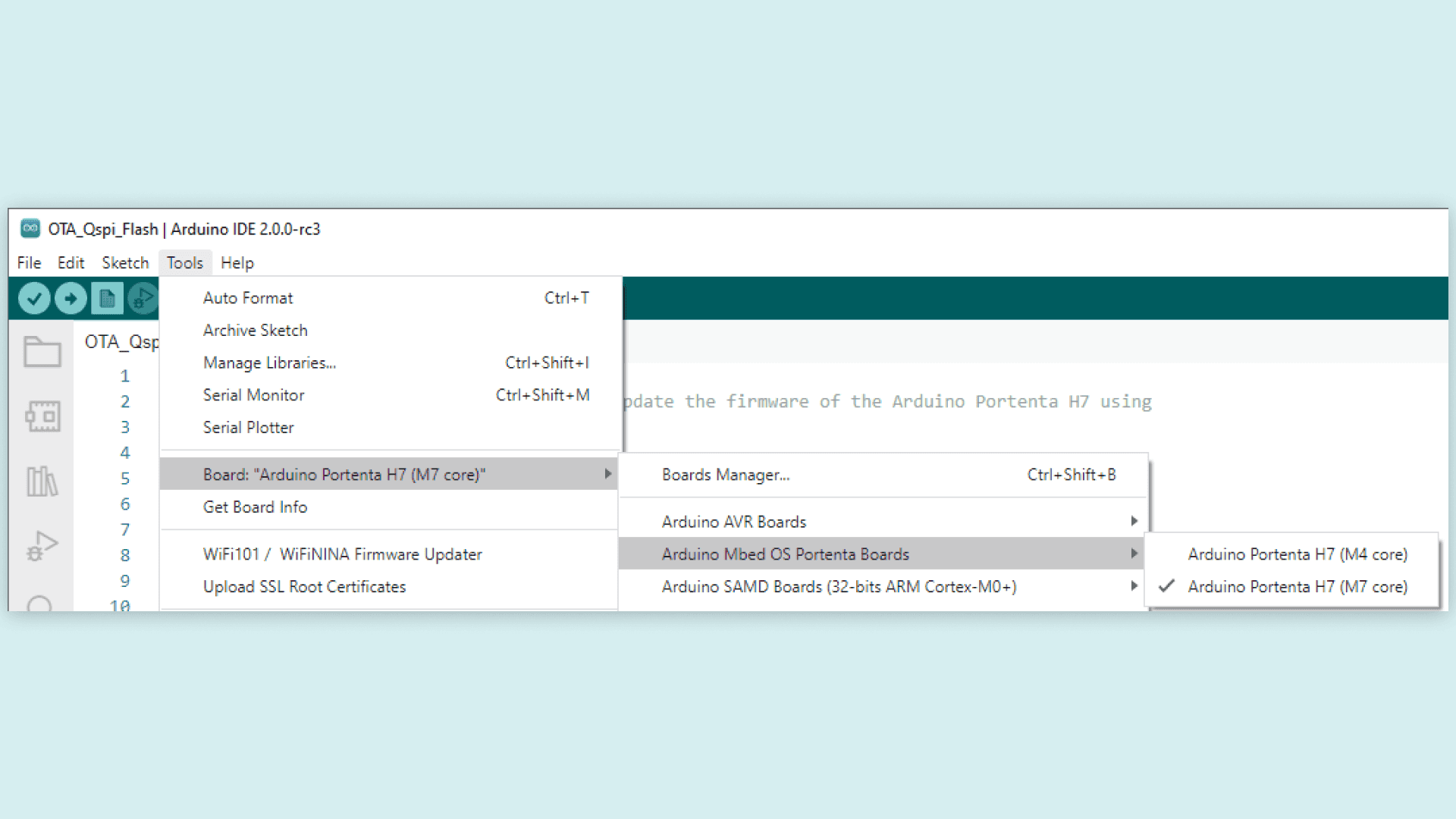 We will explain briefly the steps required to be able to use OTA (Over-The-Air) process with Arduino Portenta H7. It will consist of firmware OTA file creation and use of preferred storage mode (QSPI or SD card).
