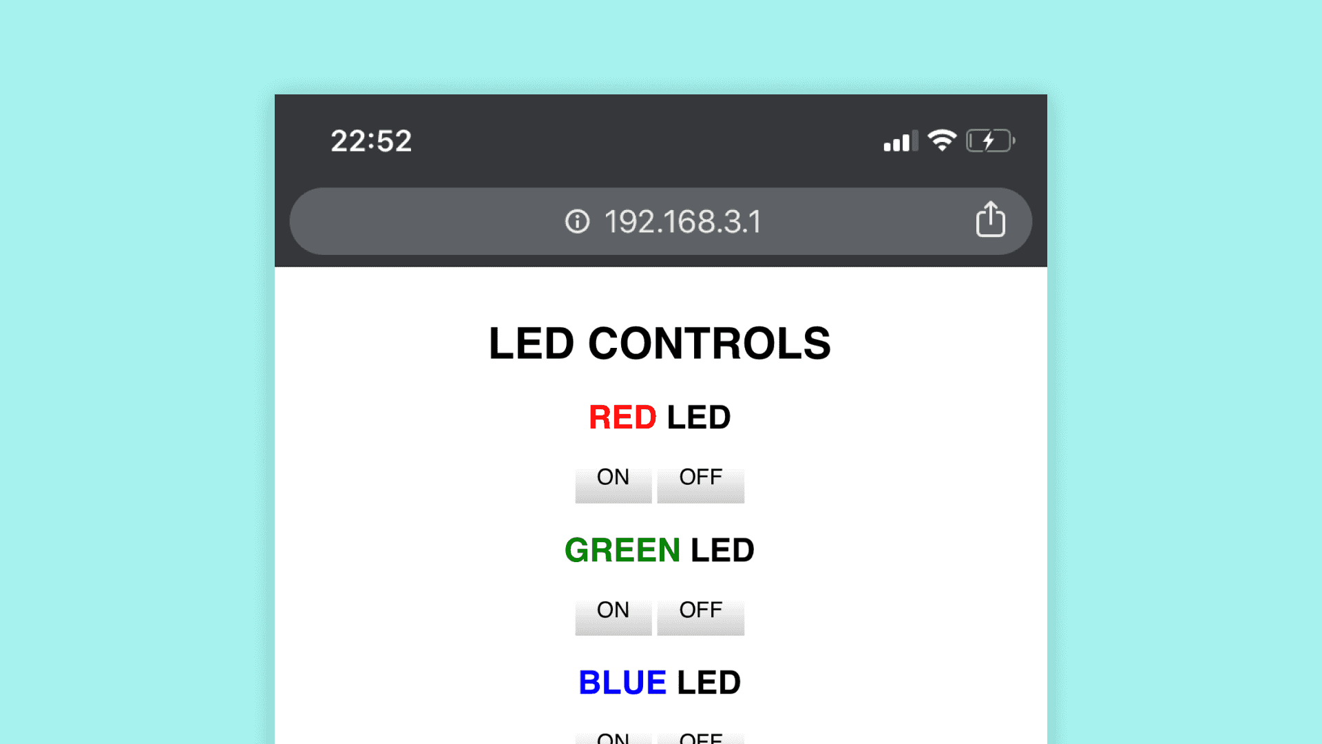 98 // the content of the HTTP response follows the header:99 client.print("<html><head>");100 client.print("<style>");101 client.print("* { font-family: sans-serif;}");102 client.print("body { padding: 2em; font-size: 2em; text-align: center;}"); 103 client.print("a { -webkit-appearance: button;-moz-appearance: button;appearance: button;text-decoration: none;color: initial; padding: 25px;} #red{color:red;} #green{color:green;} #blue{color:blue;}");104 client.print("</style></head>");105 client.print("<body><h1> LED CONTROLS </h1>");106 client.print("<h2><span id=\"red\">RED </span> LED </h2>");107 client.print("<a href=\"/Hr\">ON</a> <a href=\"/Lr\">OFF</a>");108 client.print("<h2> <span id=\"green\">GREEN</span> LED </h2>");109 client.print("<a href=\"/Hg\">ON</a> <a href=\"/Lg\">OFF</a>");110 client.print("<h2> <span id=\"blue\">BLUE</span> LED </h2>");111 client.print("<a href=\"/Hb\">ON</a> <a href=\"/Lb\">OFF</a>");112 client.print("</body></html>");113