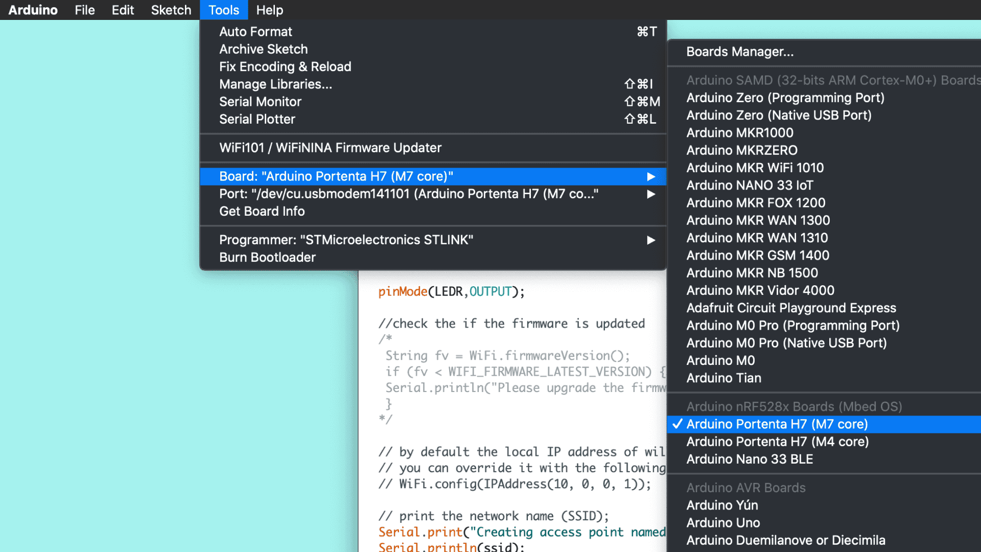 Select the Arduino Portenta H7 (M7 core) from the Board menu and the port the Portenta is connected to. Upload the simpleWebServer.ino sketch. Doing so will automatically compile the sketch beforehand.