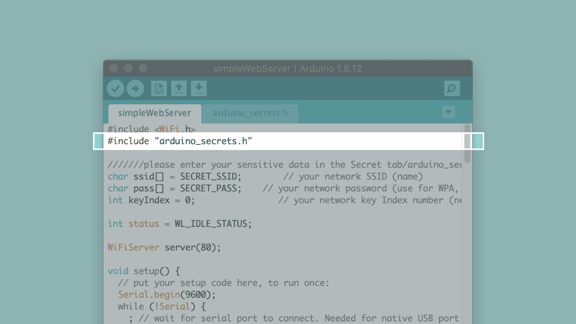 SECRET_SSID and SECRET_PASS constants in the simpleWebServer.ino sketch file, the header file that you have just created needs to be included. In your sketch file this has already been taken care of by the following line at the beginning of the sketch: 1# include “arduino_secrets.h”