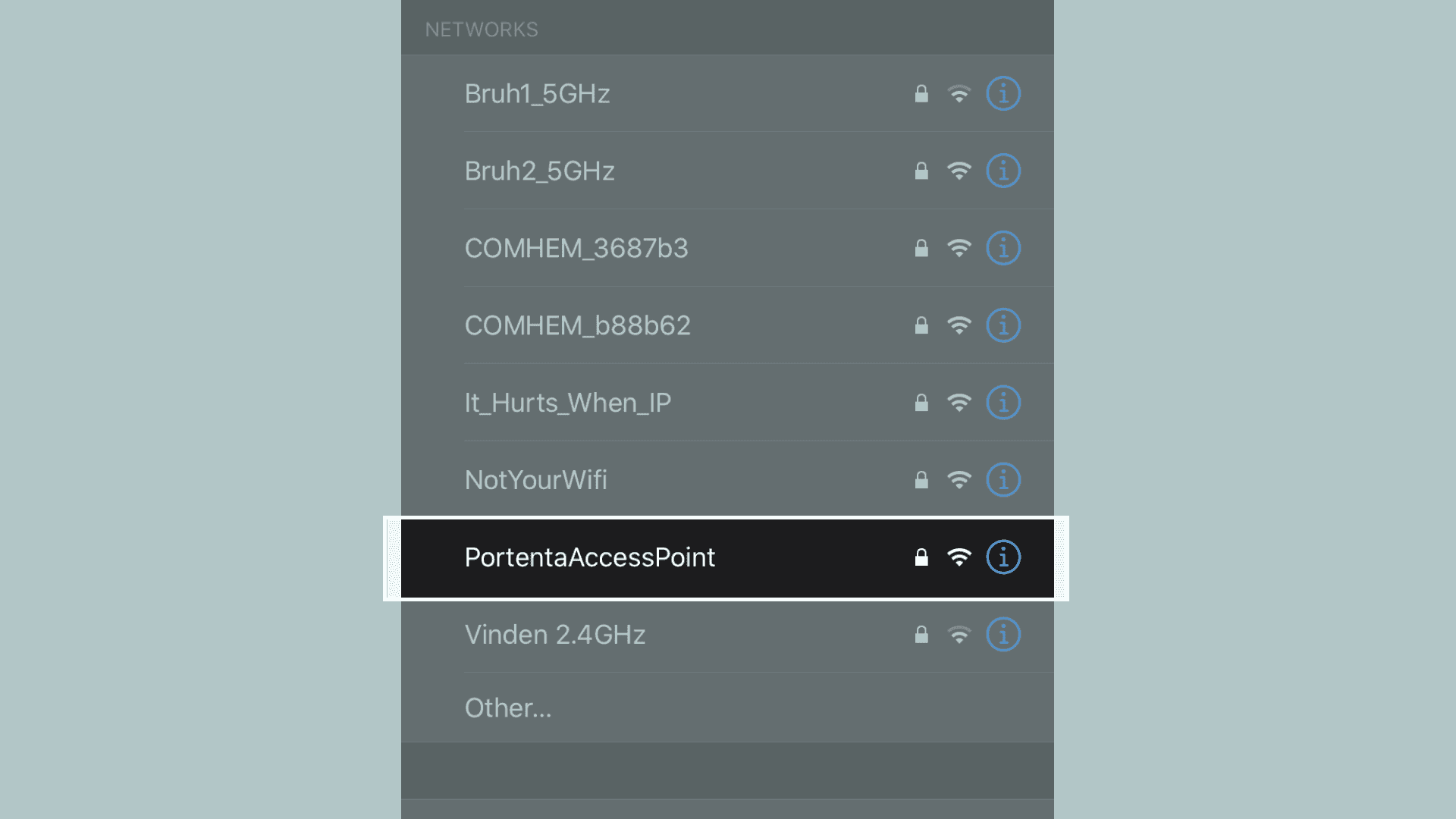 Once the access point is active and ready to be connected with external devices, you will be able to find the PortentaAccessPoint on the list of networks on your mobile device. Once you have entered the password you have defined earlier, your smart phone will connect to access point.