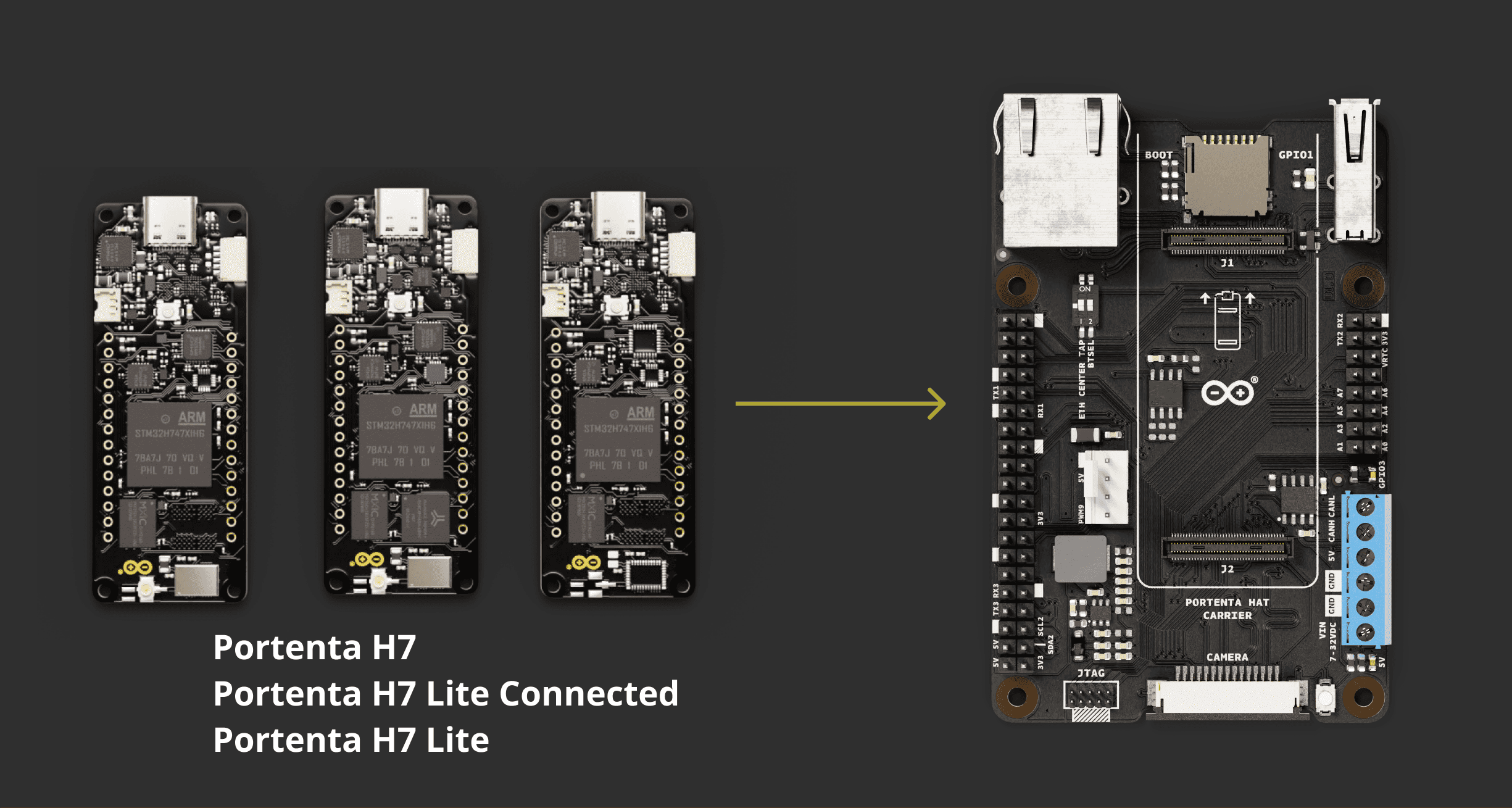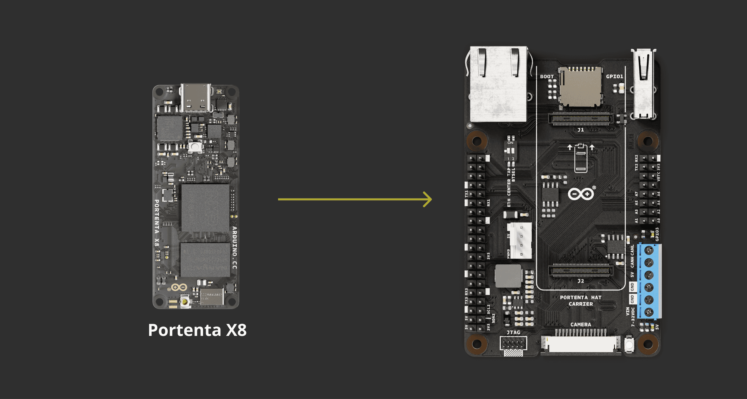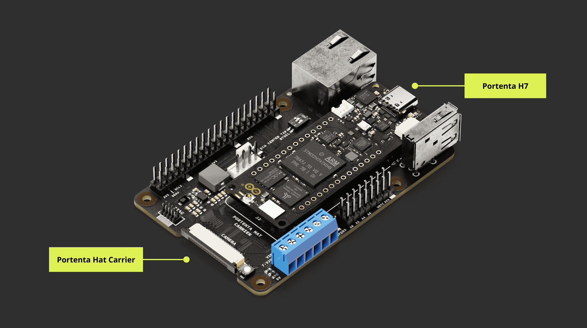 To use the Portenta Hat Carrier, it is necessary to attach one of the boards from the Portenta Family: