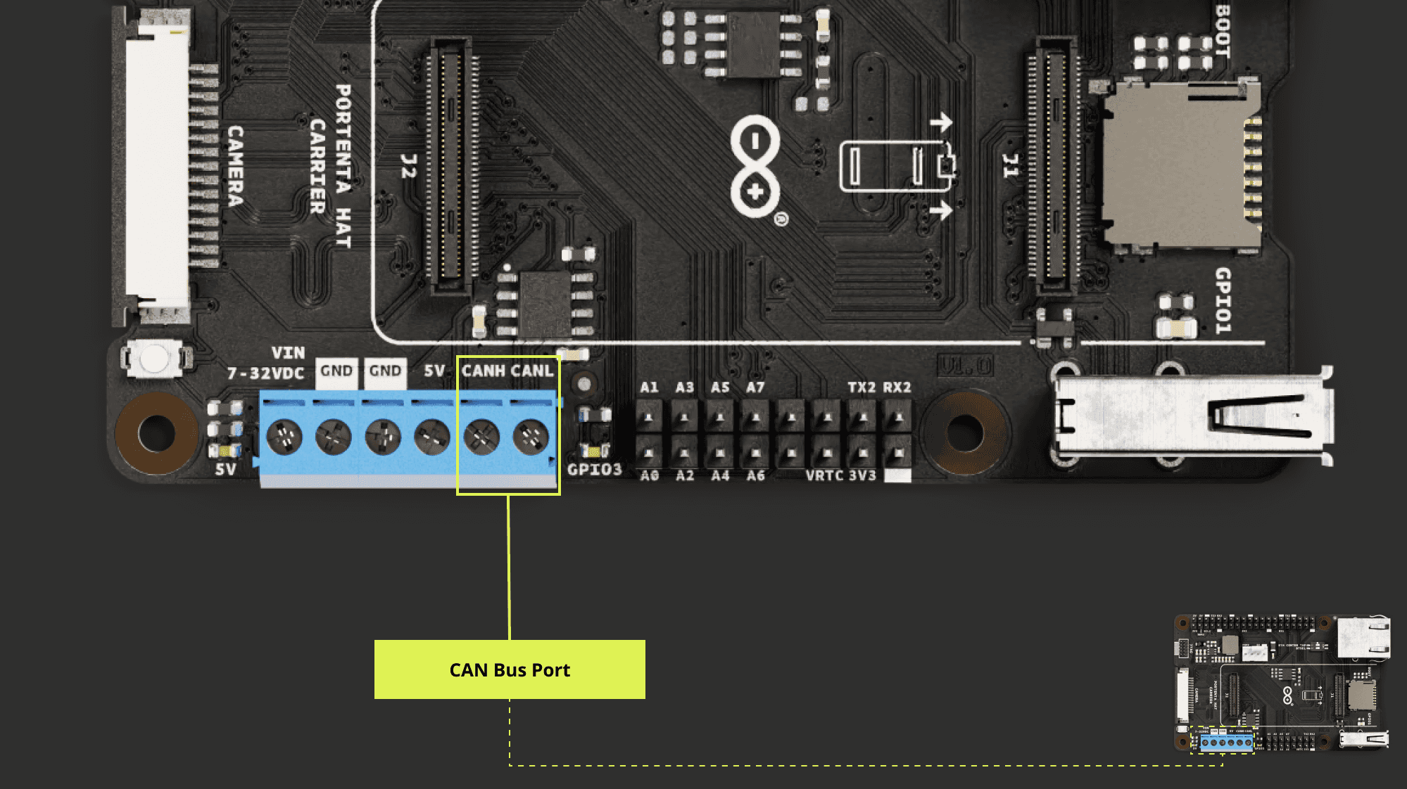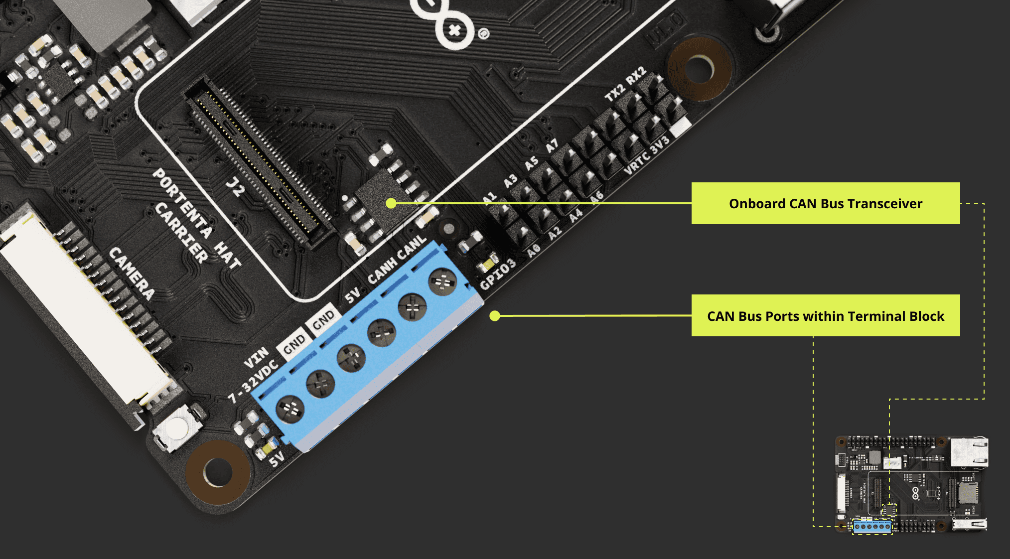 The image below magnifies the location of the terminal block for the 7 - 32 V and 5 V power source of the Portenta Hat Carrier: