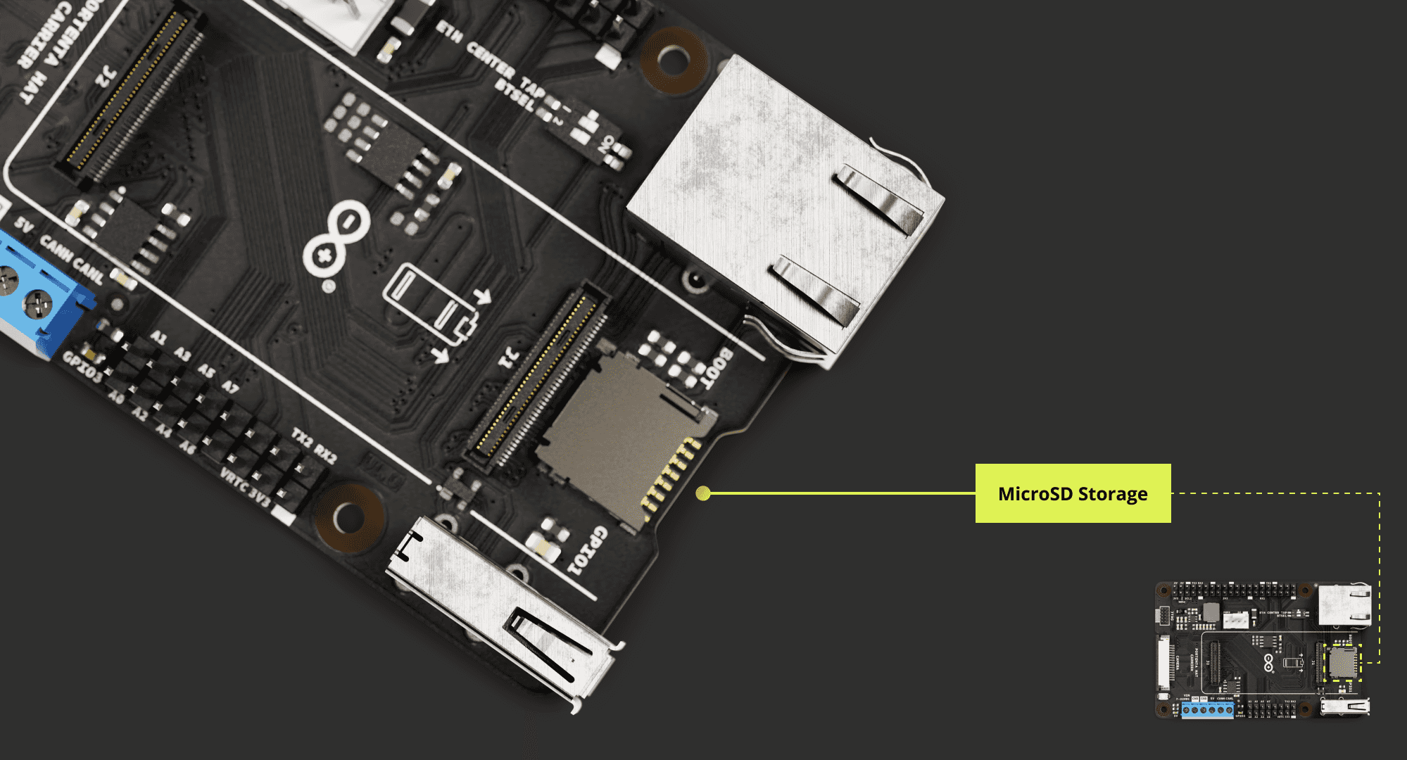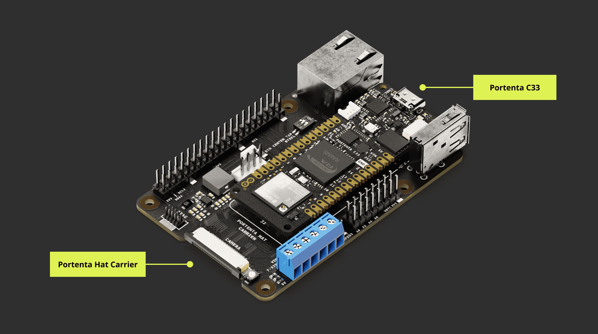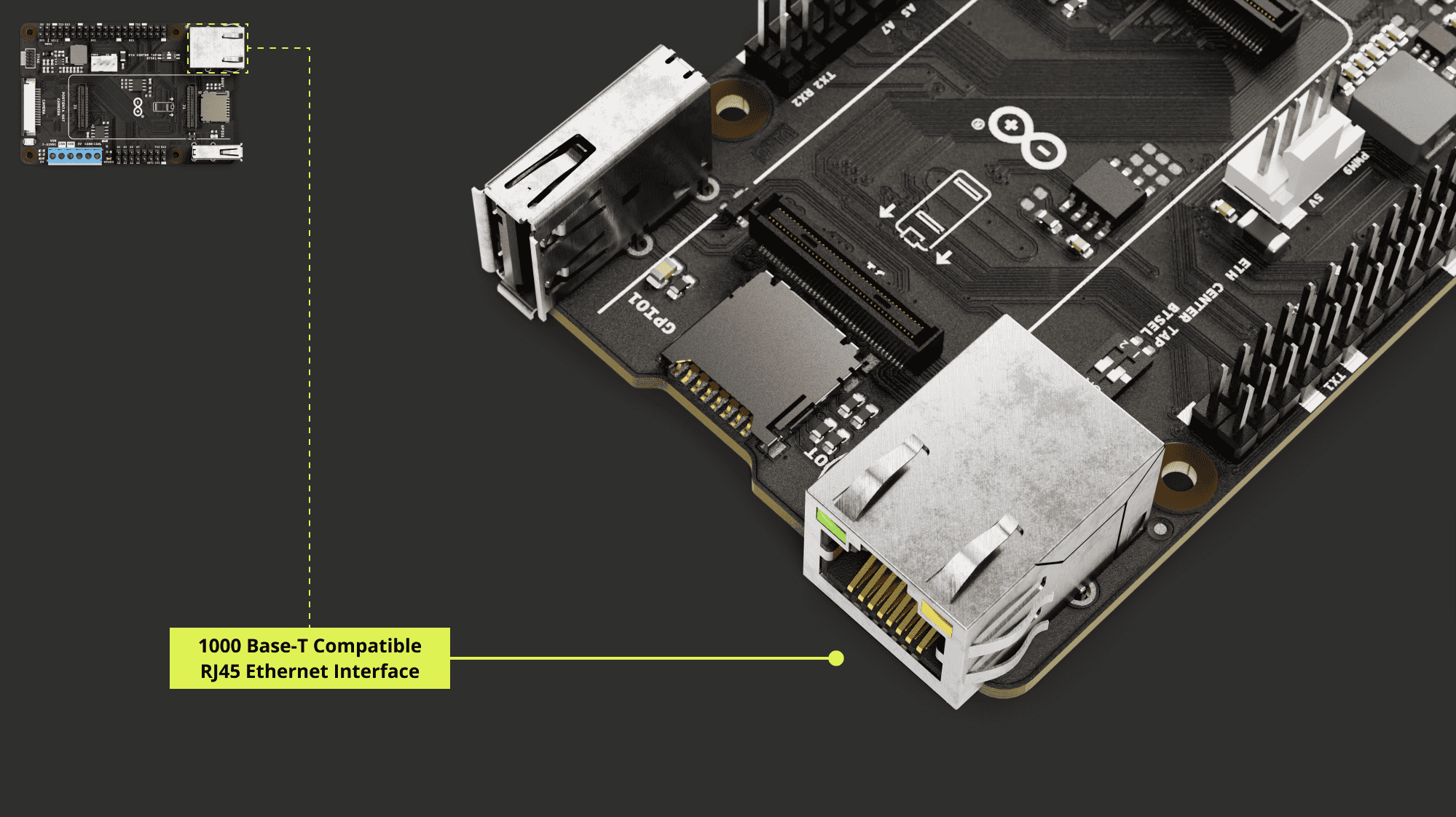 Ethernet connectivity: The carrier offers a Gigabit Ethernet interface through an RJ45 connector 1000 Base-T. If the carrier is paired with Portenta H7 or C33, the maximum speed is limited to 100 Mbit Ethernet.