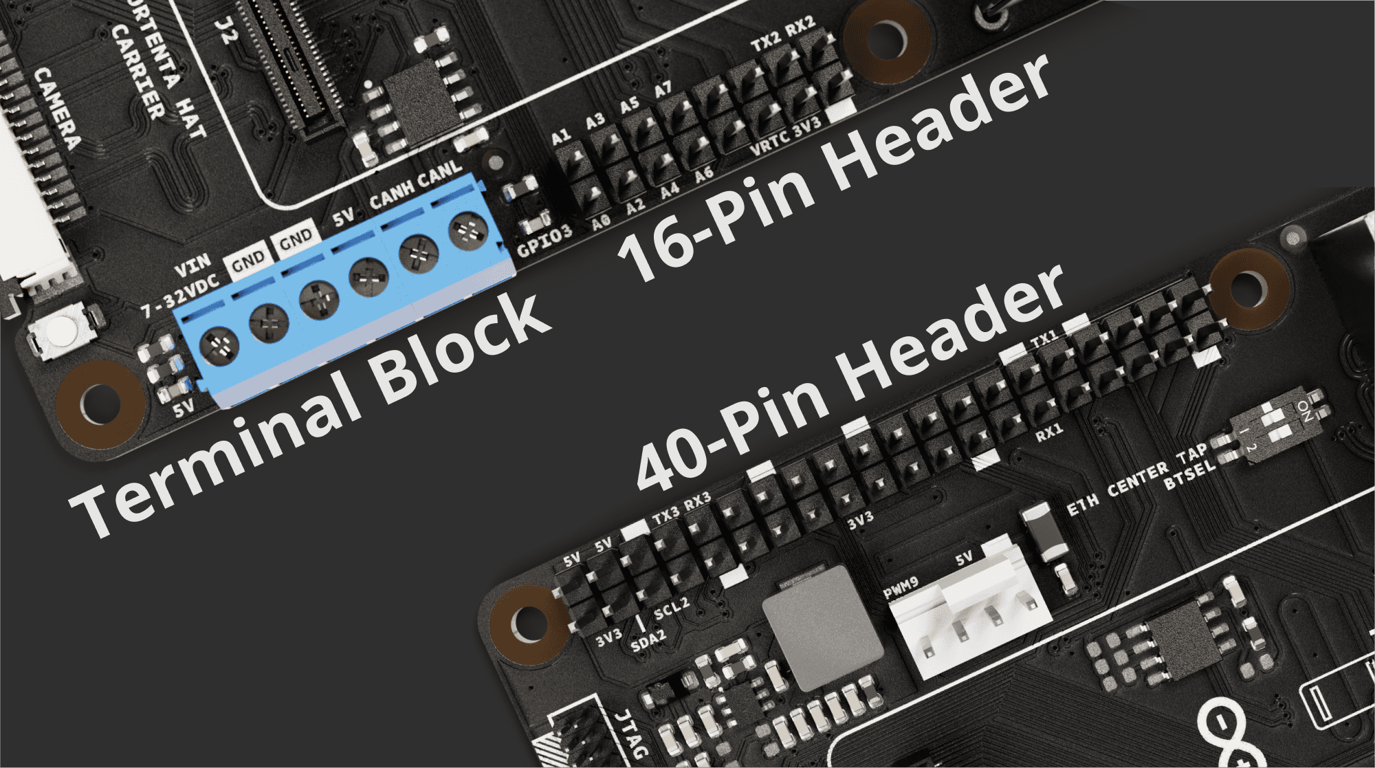 The onboard screw terminal powers both the carrier and any connected Portenta board. Additionally, this terminal connector includes reverse polarity protection for enhanced safety.