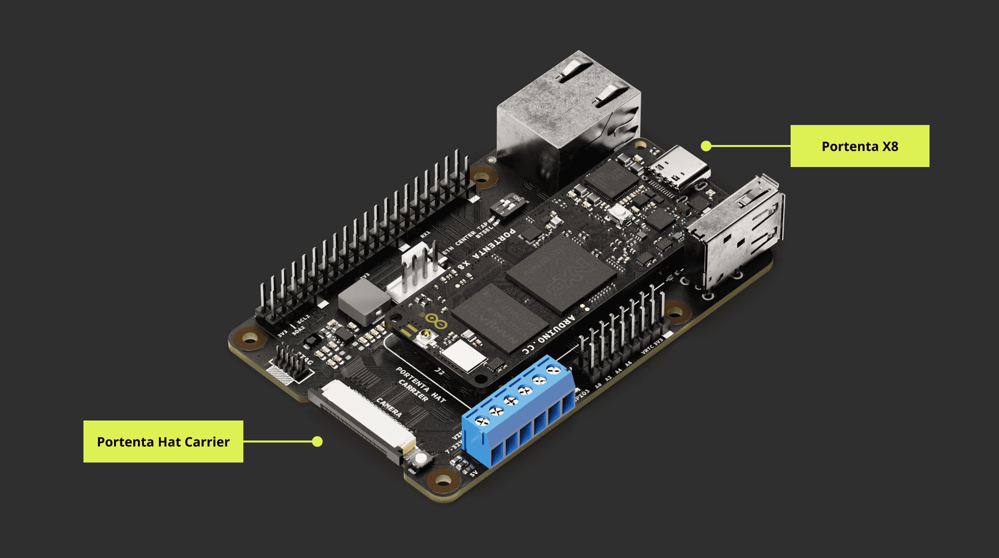 - Using a USB-C® cable (not included) connected to the Portenta core board of your choice powers not only the selected core board, like the Portenta X8, H7, or C33, but also the Portenta Hat Carrier, and any connected hat that does not require a dedicated external power supply.