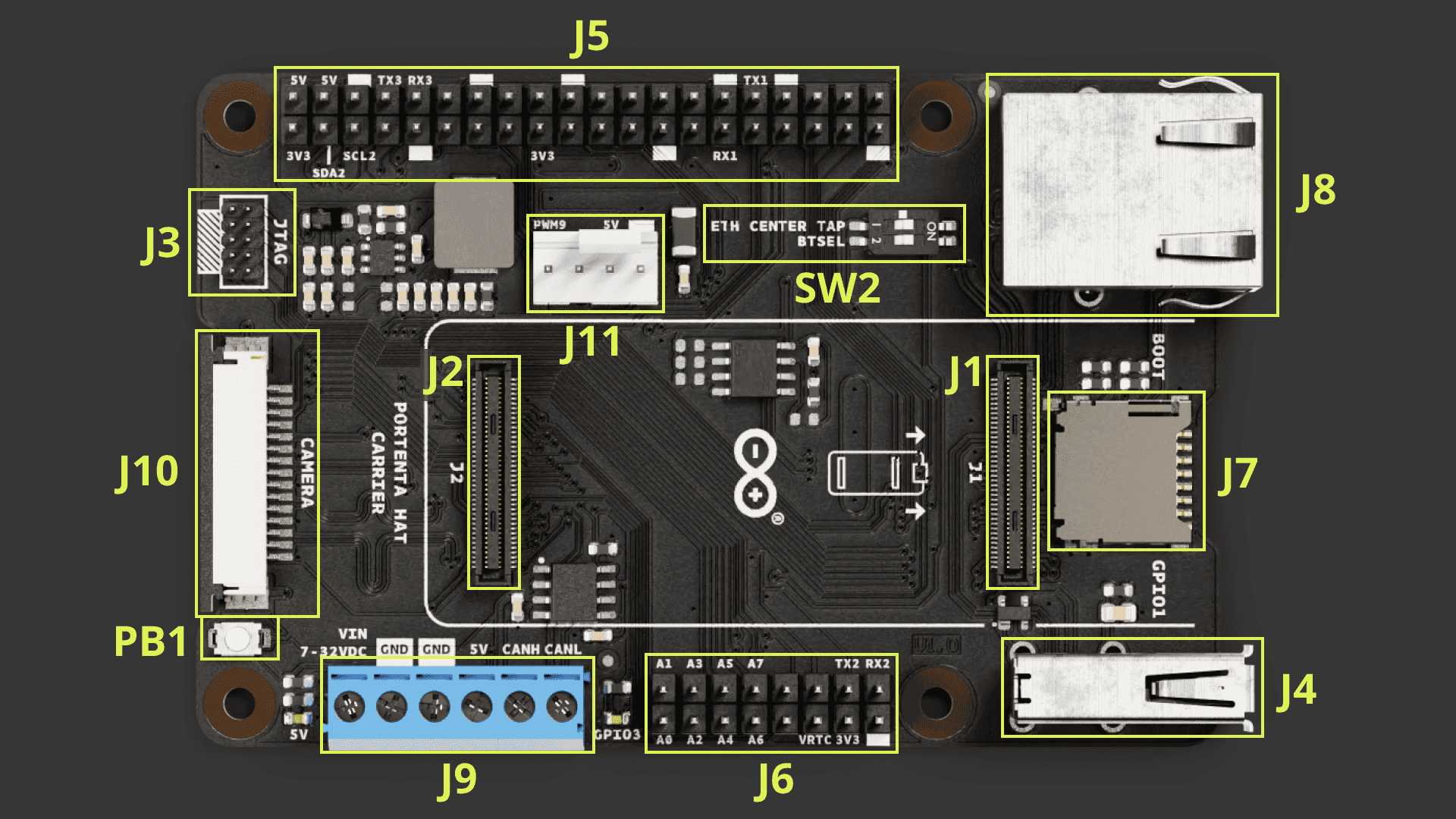 DIP switch: The carrier features a DIP switch with two positions, allowing for different profiles depending on the paired Portenta board. This DIP switch includes both the ETH CENTER TAP and BTSEL switches.