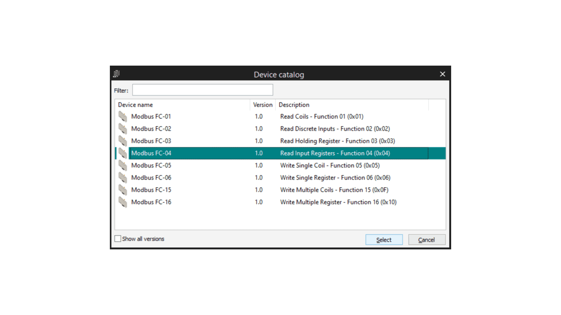 Modbus FC-04 1.0 Read Input Registers - Function 04 (0x04) to read the temperature values on the Portenta Machine Control database, and click Select.After clicking on