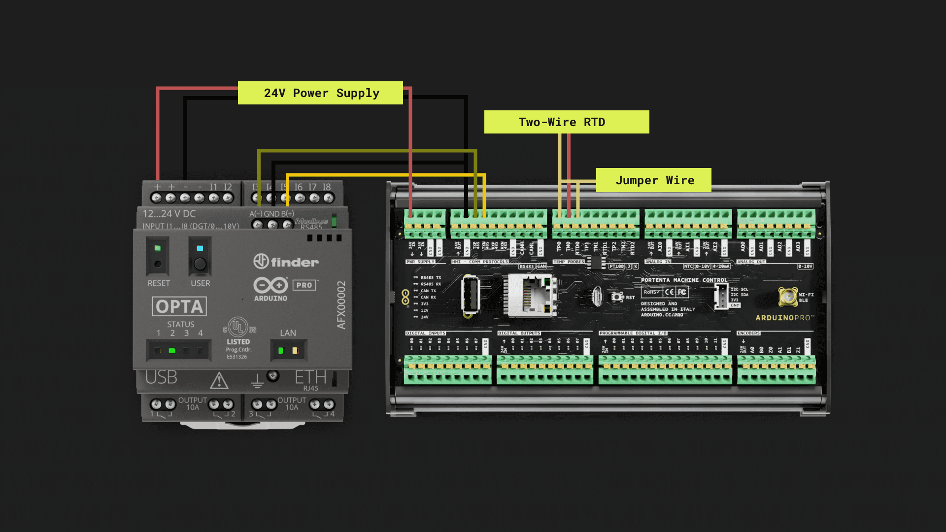 In this tutorial, a Two-wire PT100 RTD is used, but you can also use a Three-wire RTD or a thermocouple depending on your requirements or preferences. You can learn more about the differences between these temperature sensors and how to connect them to the Portenta Machine Control following the previously mentioned tutorial. It is recommendable to read this tutorial to learn the basics about the temperature sensors introduced earlier.
