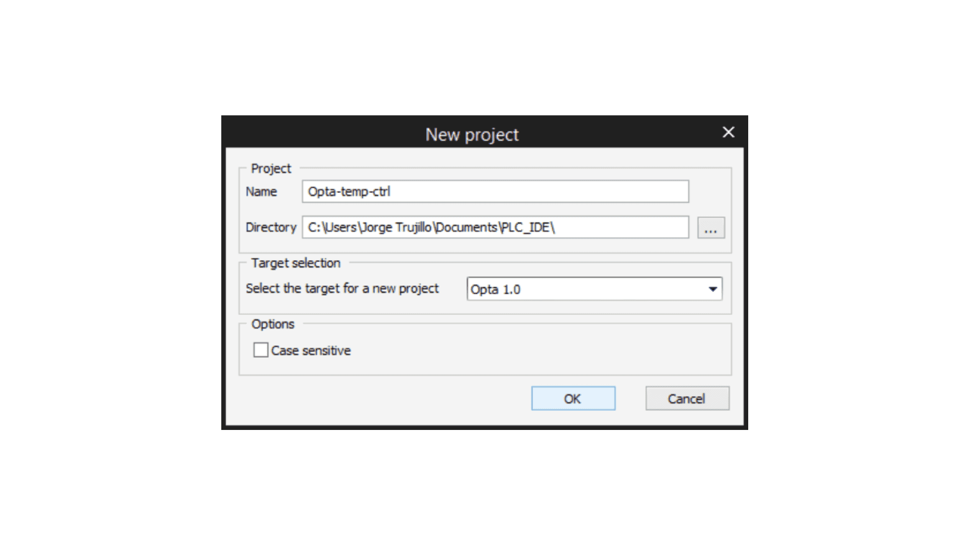File > New Project. It will display a new window where you have to insert a name for the Opta™ project and make sure that the Opta 1.0 is selected on the Target Selection:Client Modbus Configuration