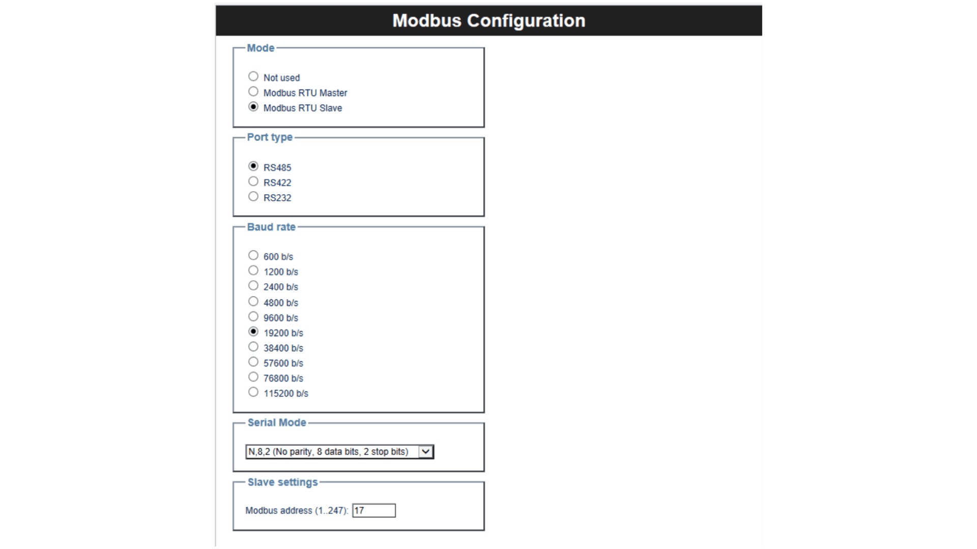 In this case, Modbus Server address is set as 17, but you can define one address in the