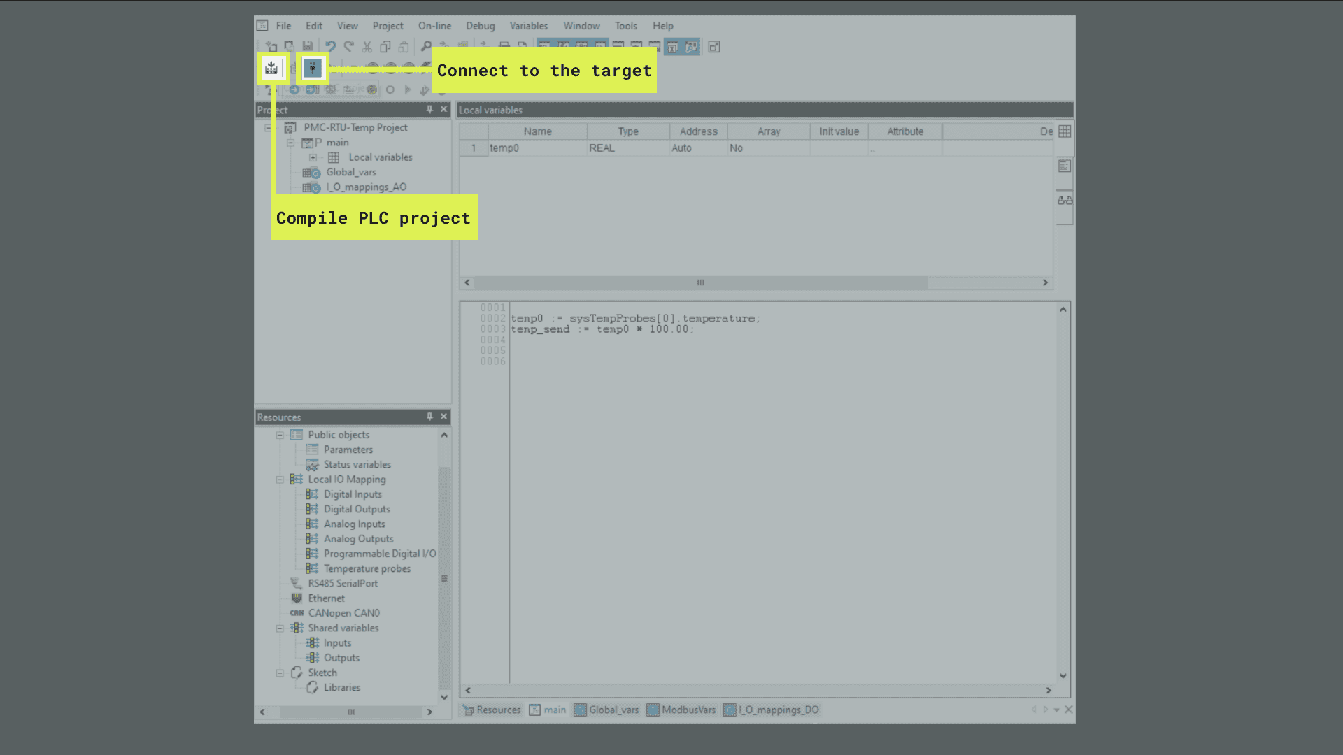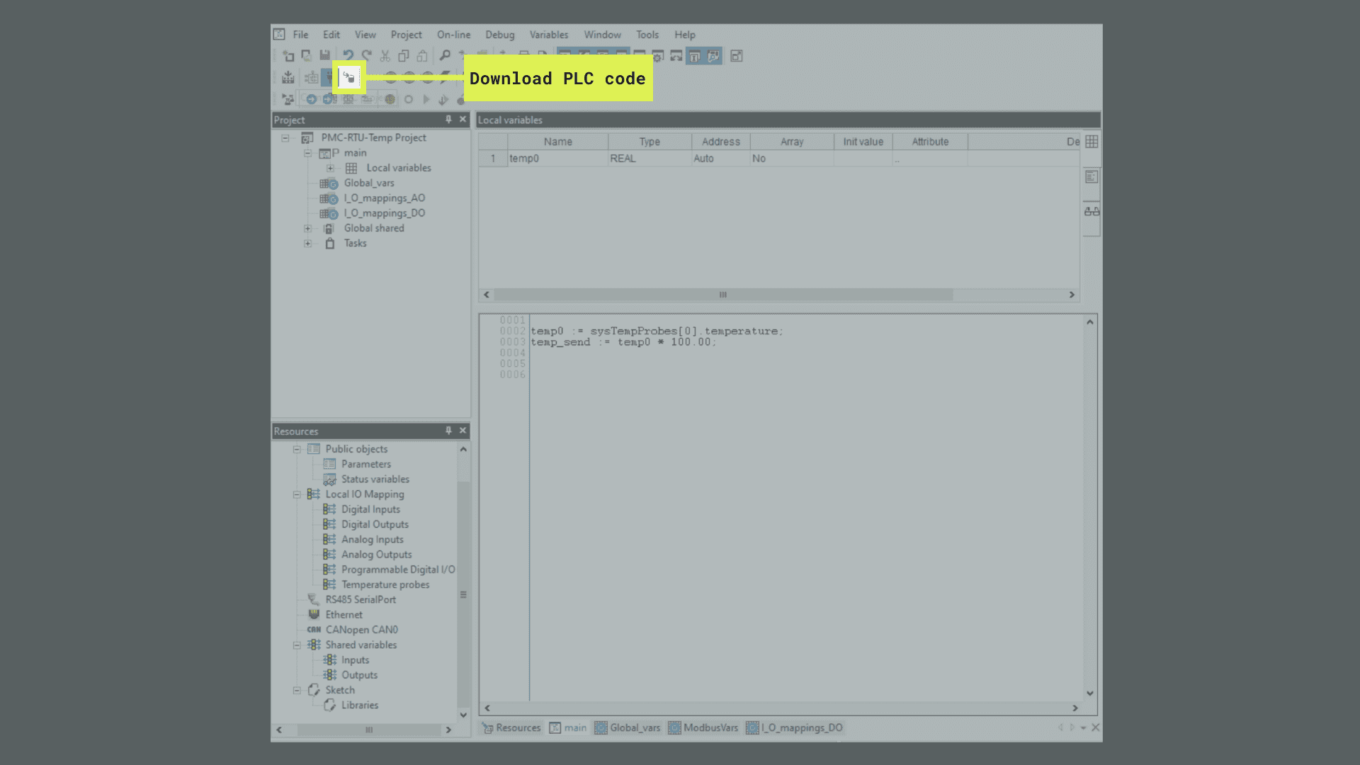 Download PLC code to download it to the board. You can also do it by going to On-line > Download code or by pressing the F5 key:To ensure that we are reading correct temperature values on the Portenta Machine Control, you can pick and drop the variable to the