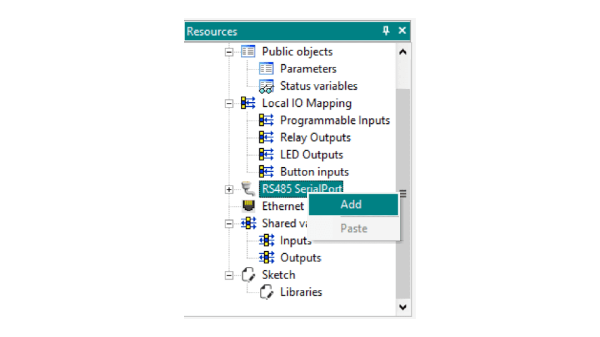 Resources tab and right-click on RS485 SerialPort and click on Add:A new window named