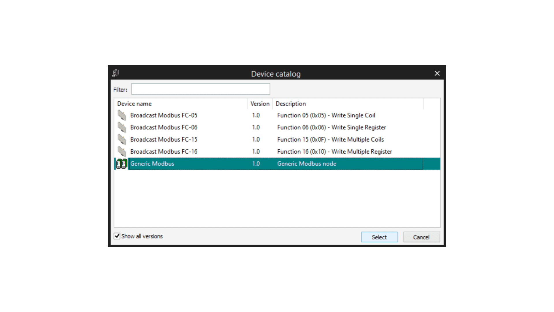Device catalog will appear. On this window, select Generic Modbus 1.0 Generic Modbus node and click on Select:On the