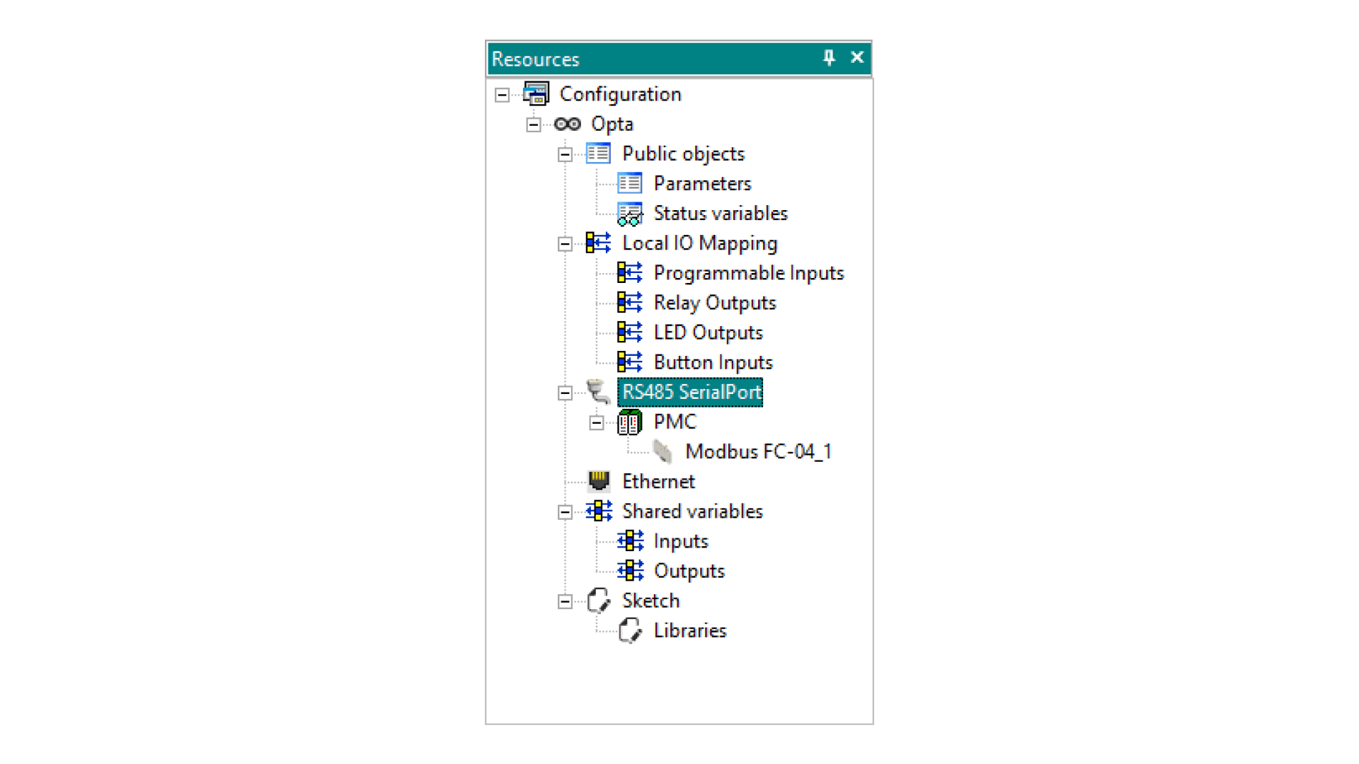 Once created, you will configure the Modbus RTU connection through the RS-485 serial port. To do this, go to the resources window and double-click on