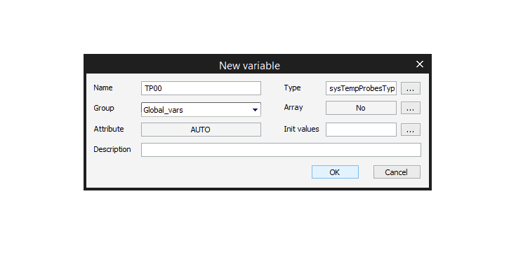 Project > New object > New variable > Automatic. A New Variable Window will appear, set TP00 as the variable name. This is just a name, not related to the name of the input, so you can set a name of your choice.