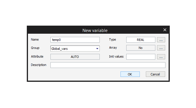 Repeat the previous steps to create a new variable called "temp0" and type "REAL". With this last variable, we will directly store the temperature value of the sysTempProbesType variable in real numbers as you will see in the following steps.