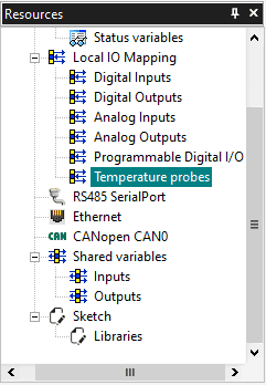 Once the project has been created, to visualize the "Temperature probes" inputs of the board, you need to go to the Resources Tools window and click on "Temperature probes". If you cannot find this window, you can try to click on: