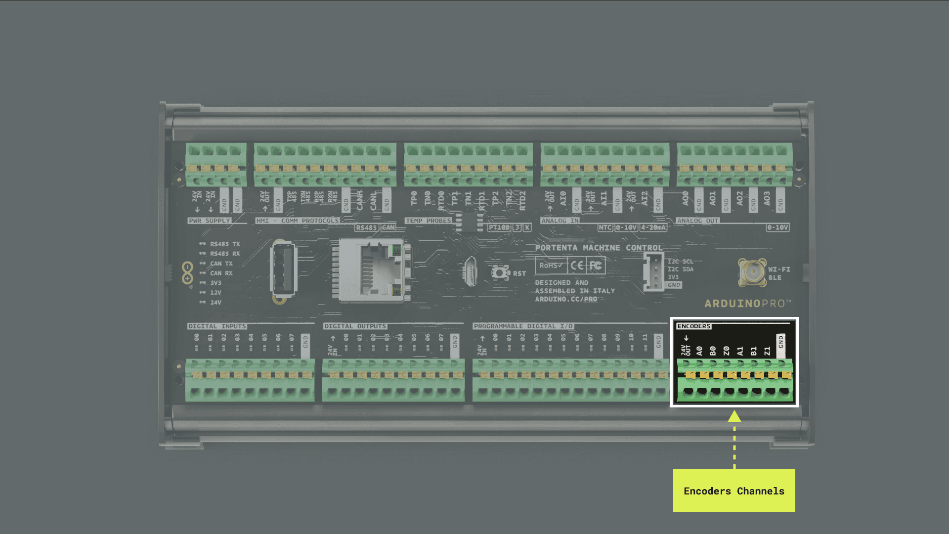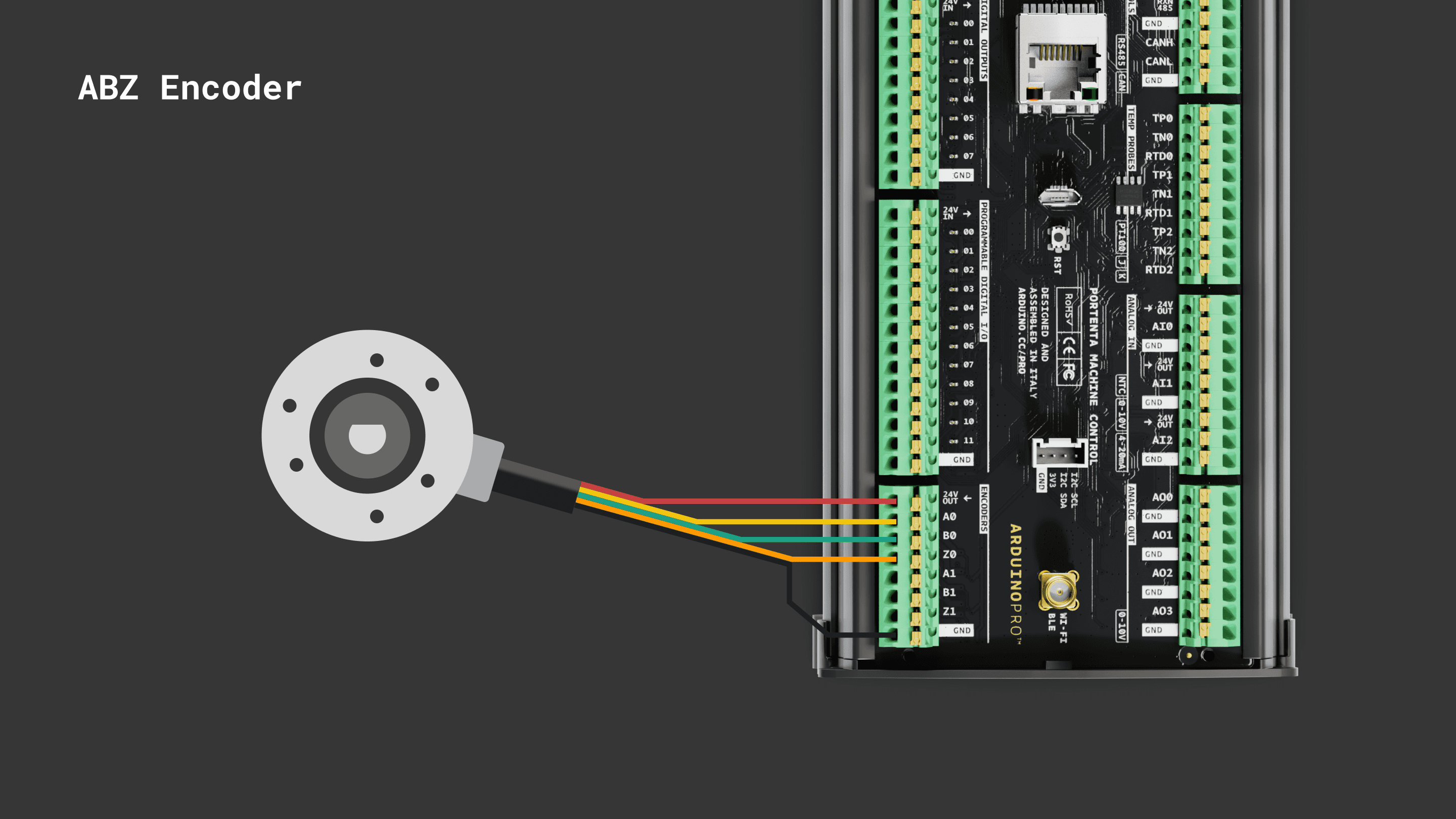 Arduino Mbed OS Portenta Boards core and the Arduino_PortentaMachineControl have built-in libraries and functions that enable you to utilize the Portenta's Machine Control encoders. The following example shows how to read information from encoder channel 0 of a Portenta Machine Control device; for wiring an ABZ encoder to the Portenta Machine Control, follow the diagram below: