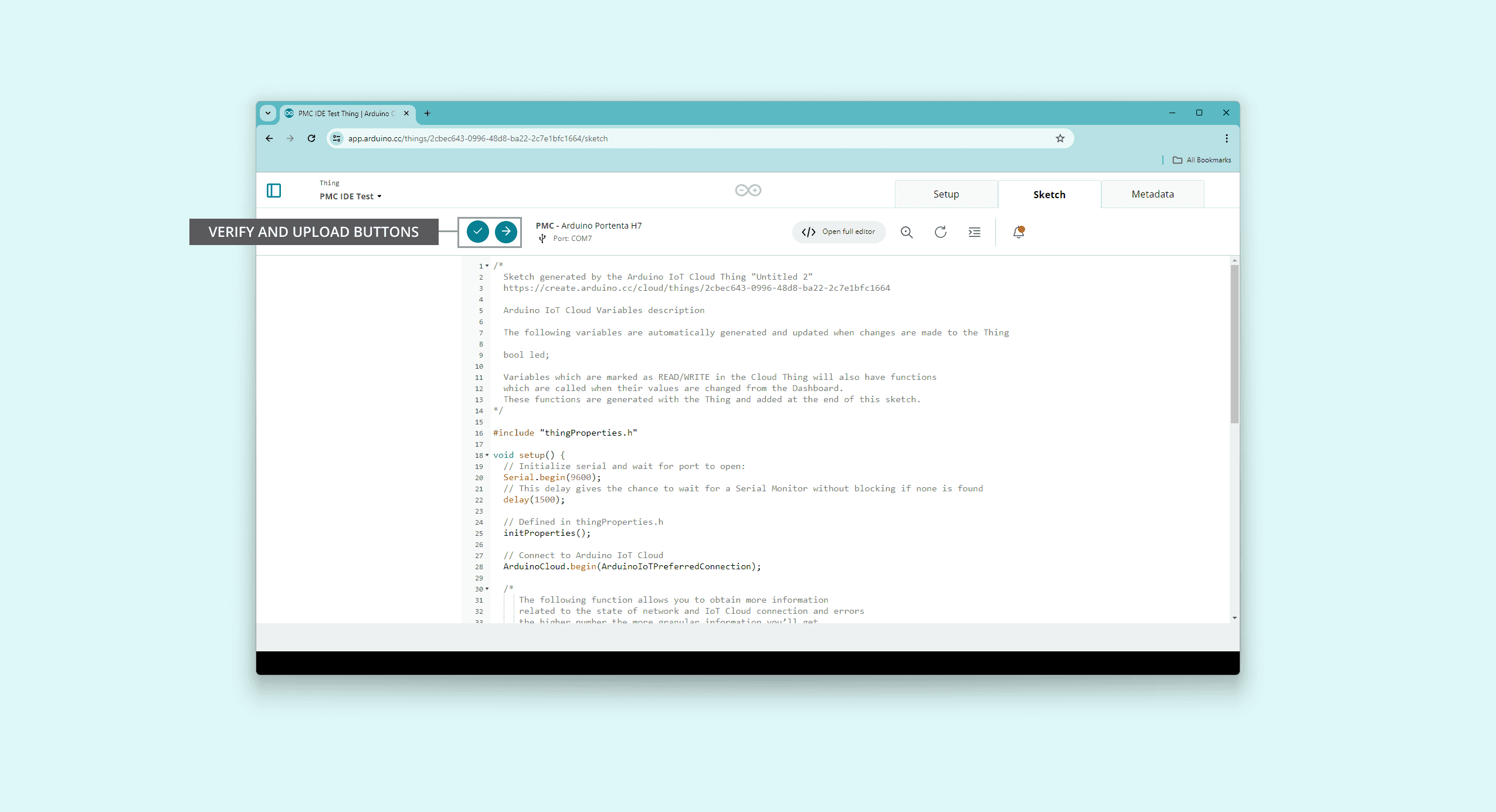 49/*50 Since Led is READ_WRITE variable, onLedChange() is51 executed every time a new value is received from Cloud.52*/53void onLedChange() {54 // Change digital output state of channel 0 according to led variable state (true-HIGH, false-LOW)55 MachineControl_DigitalOutputs.write(0, led ? HIGH : LOW);56}To upload the code to the Portenta Machine Control from the online editor, click the green Verify button to compile the sketch and check for errors, then click the green Upload button to program the board with the sketch.