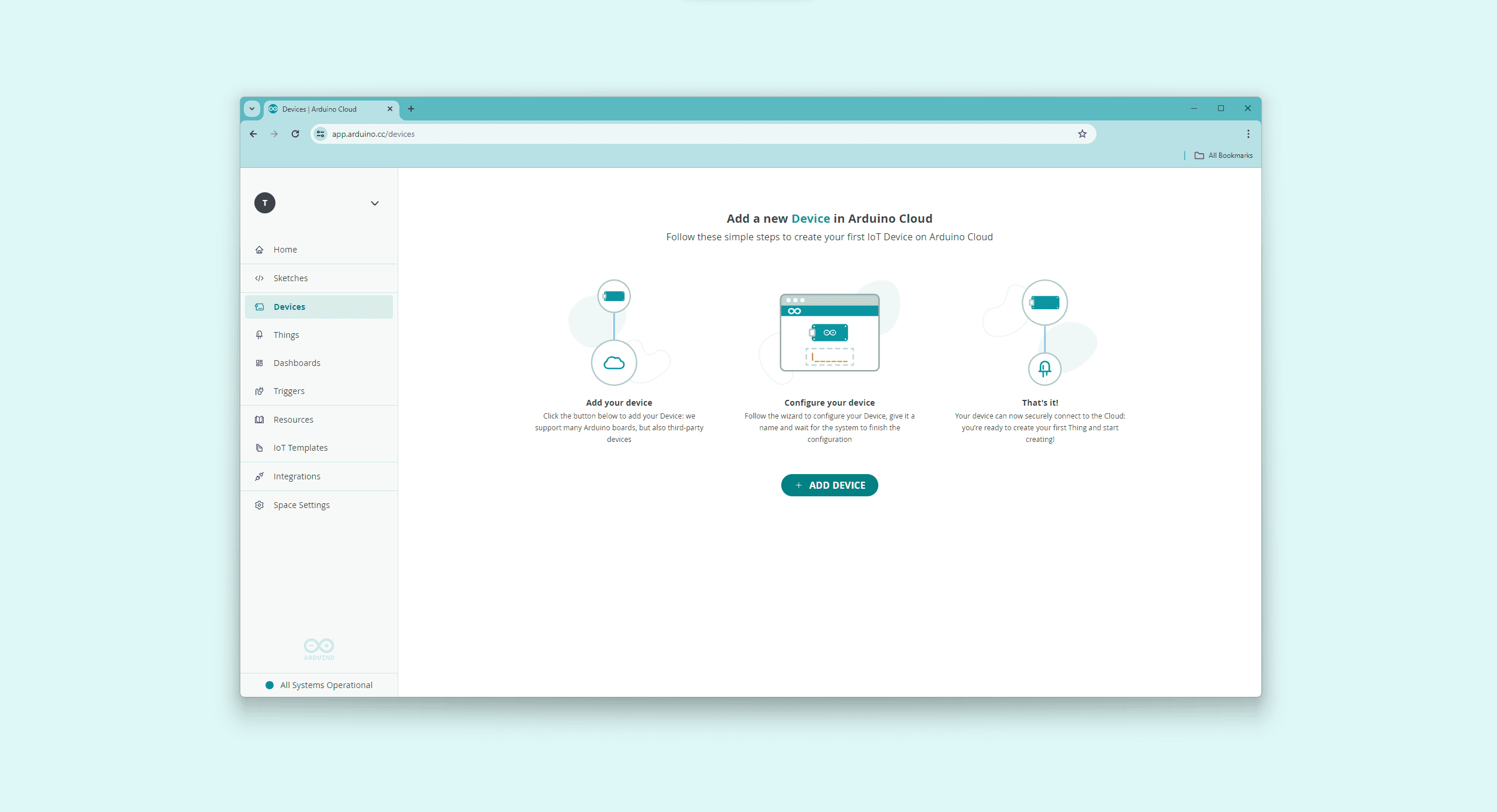 Let's walk through a step-by-step demonstration of how to use a Portenta Machine Control device with Arduino Cloud. Log in to your Cloud account; provision your Portenta Machine Control on your Cloud space. To do this, navigate to Devices and then click on the ADD DEVICE button: