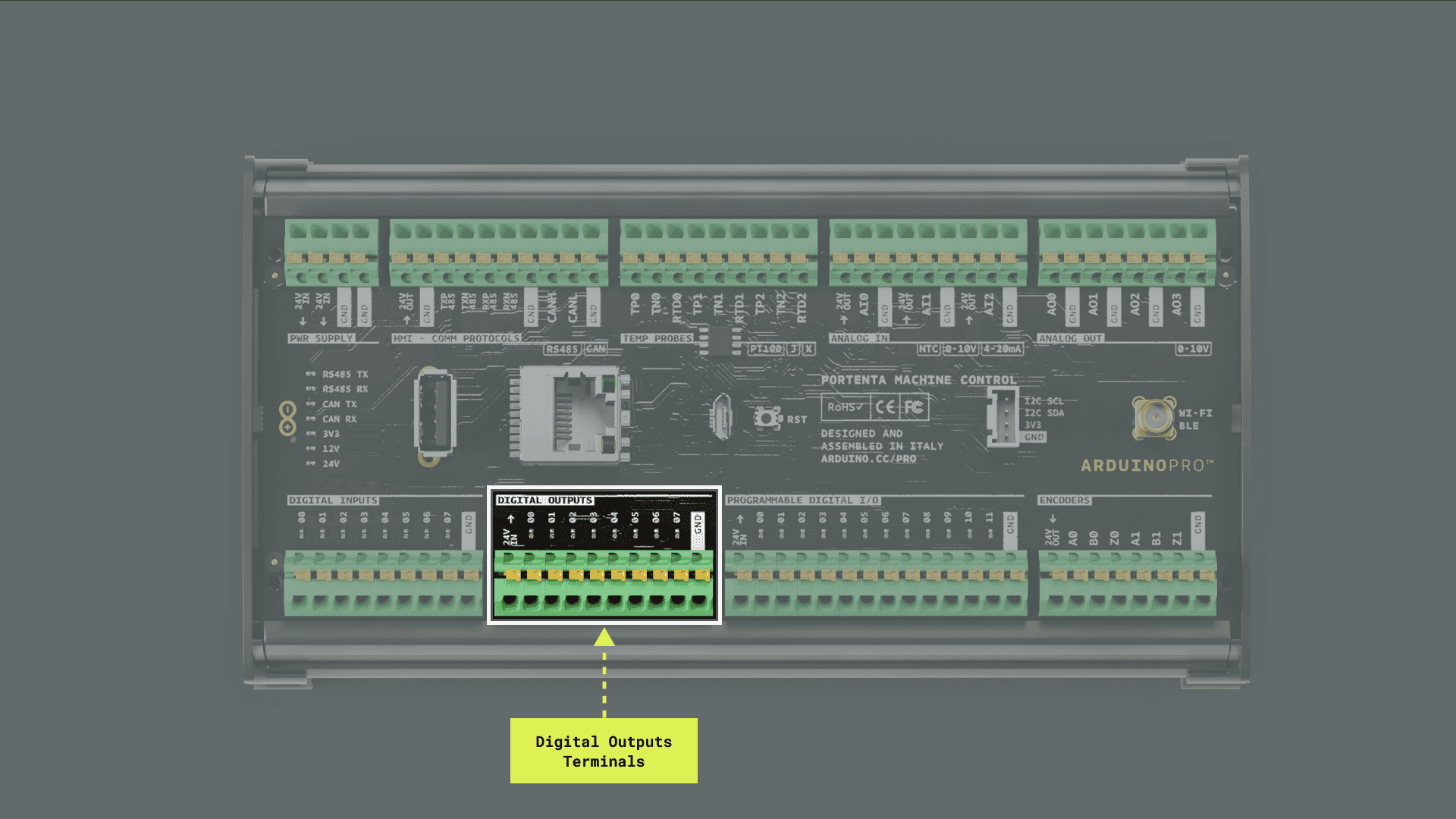 10 // Initialize the digital outputs terminals of the Arduino_PortentaMachineControl library11 MachineControl_DigitalOutputs.begin();12