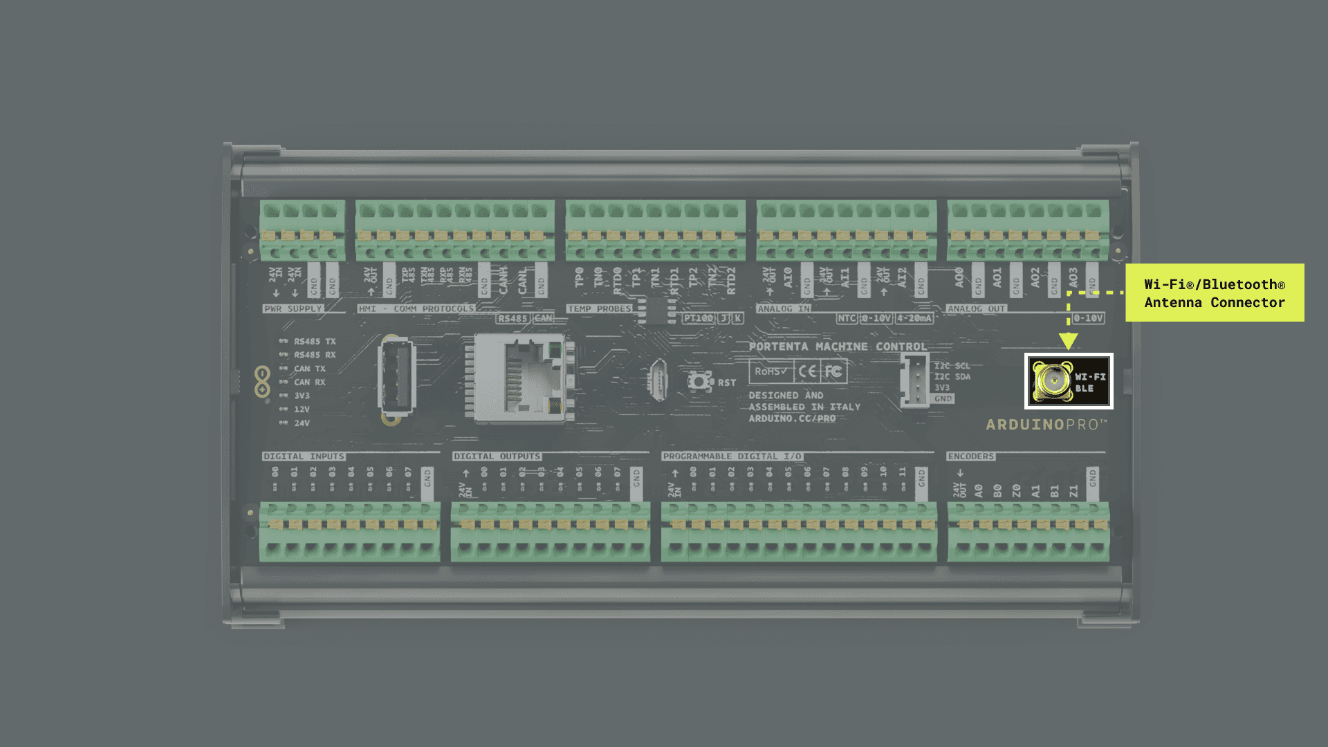 Wireless connectivity: The Portenta Machine Control supports 2.4 GHz Wi-Fi® (802.11 b/g/n) and Bluetooth® Low Energy (4.2 supported by firmware and 5.1 supported by hardware).