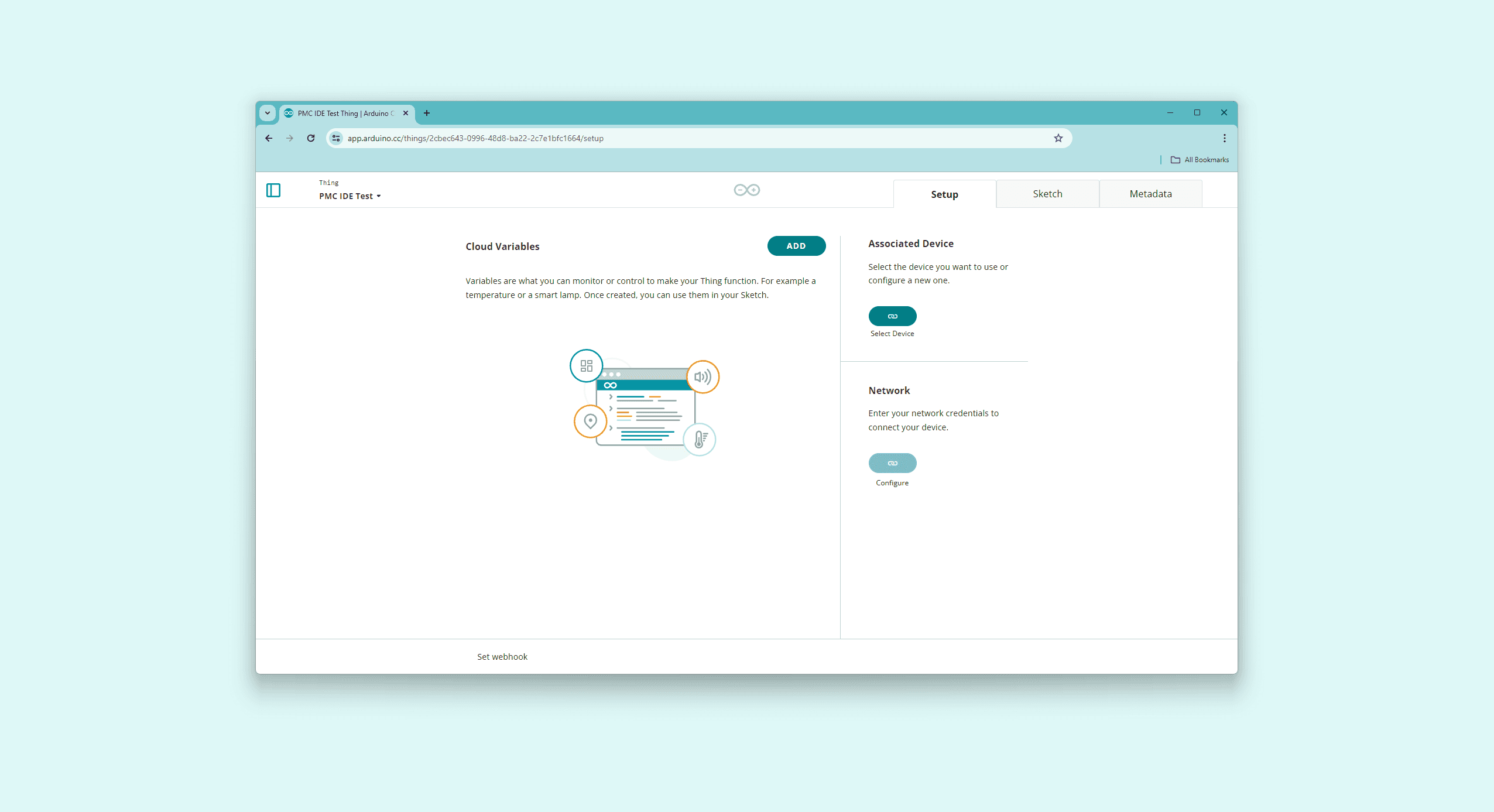 Navigate into Associate Device and click the Select Device button. Select your Portenta Machine Control device and associate it with your "Thing." Then, navigate into Network and click the Configure button; enter your network credentials.