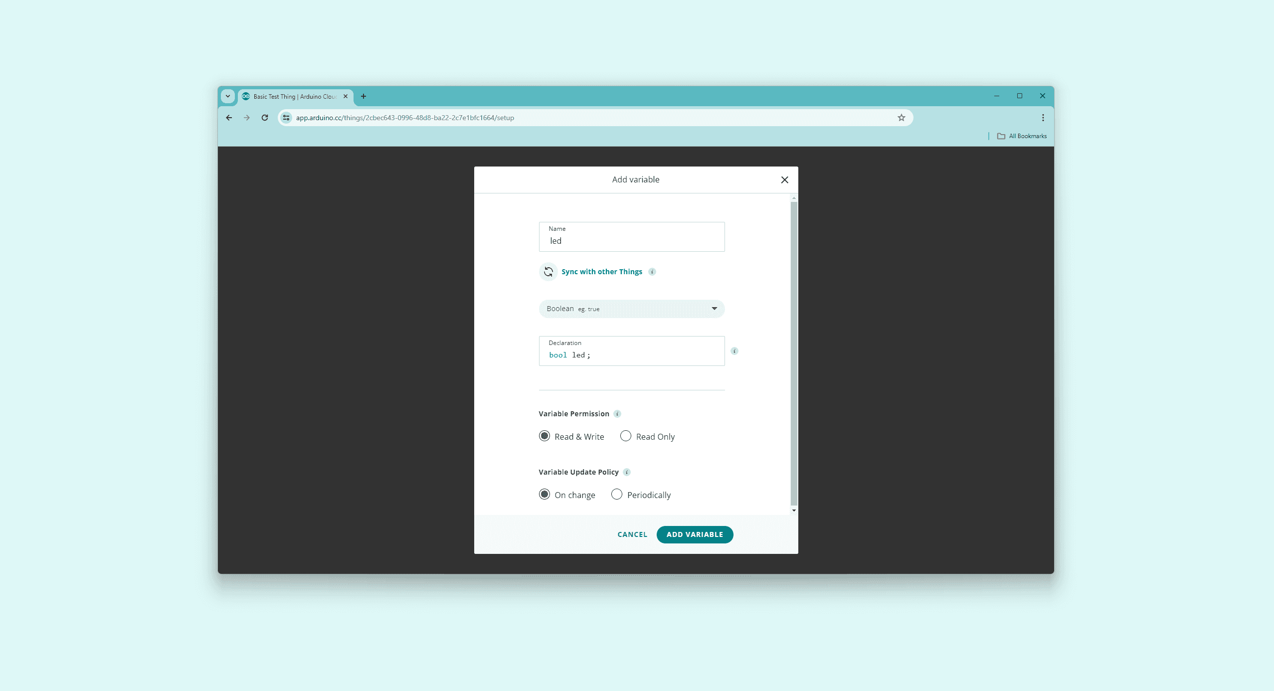 onLedChange() function, which was generated automatically by Cloud when the variable led was created, you must associate the digital output at channel 0 state with the led variable:1/*2 Since Led is READ_WRITE variable, onLedChange() is3 executed every time a new value is received from Cloud.4*/5void onLedChange() {6 // Change digital output state of channel 0 according to led variable state (true-HIGH, false-LOW)7 MachineControl_DigitalOutputs.write(0, led ? HIGH : LOW);8}The complete example sketch can be found below:
