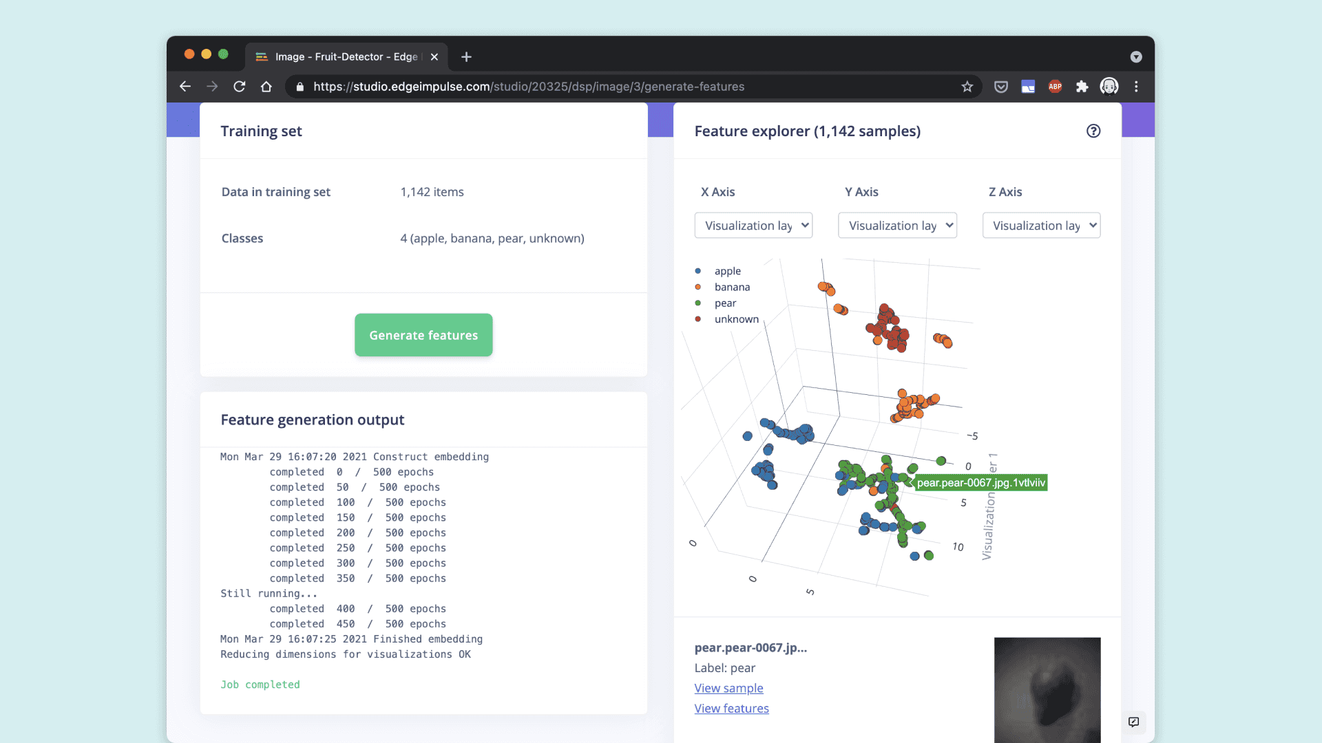 Then click on "Generate Features". The analysis process will take a while to complete depending on the amount of images that you uploaded. When it is done, you can inspect the results. On the right hand side you can see a visualization of the features in a 3D space. You can see that apples (blue dots) and pears (green dots) are somewhat hard to tell apart due to their round shape and therefore they have some overlapping data points in that visualization. A banana, on the other hand, is easier to distinguish as it looks quite different.