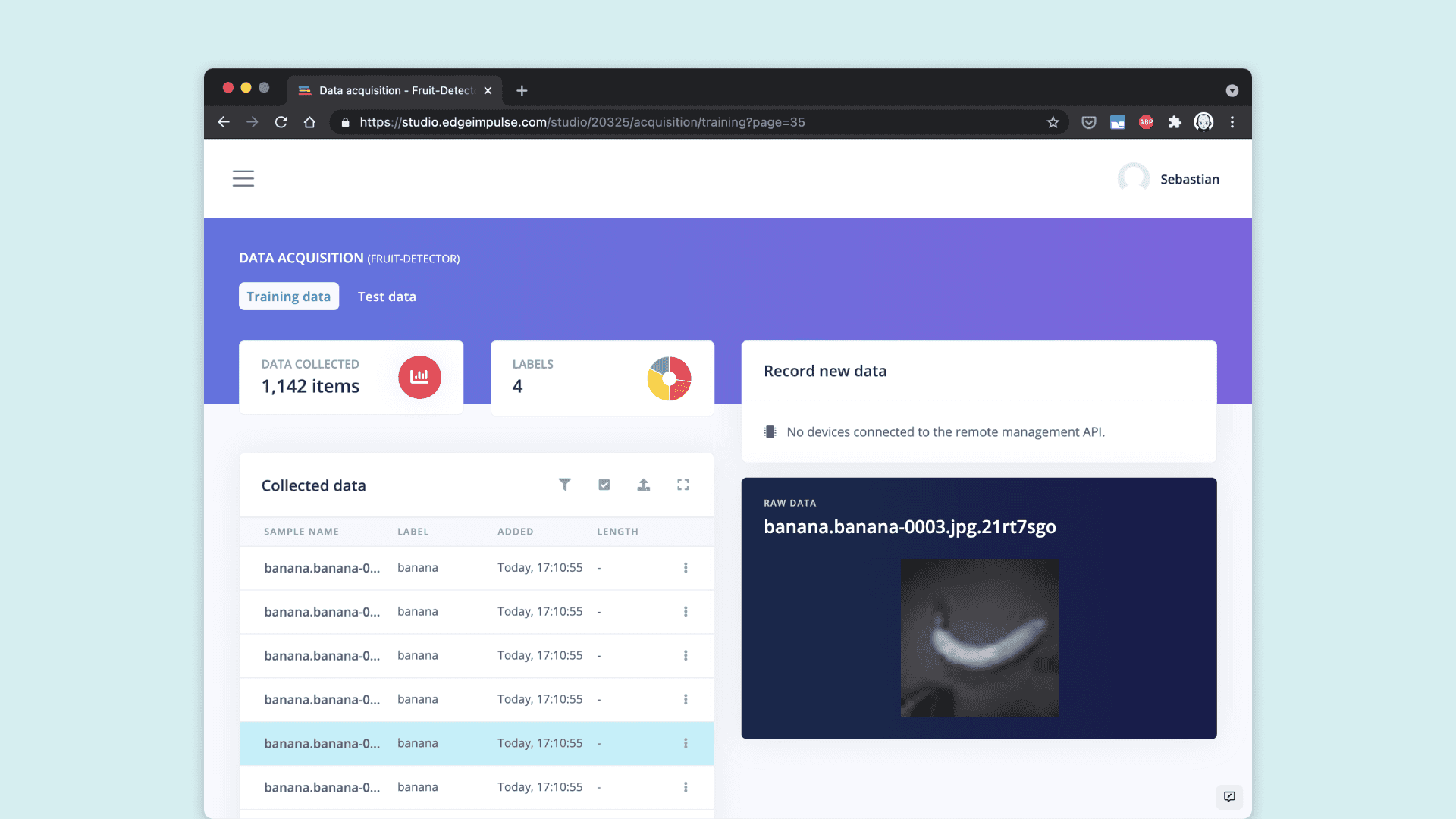 Open your project in the Edge Impulse® studio and navigate to "Data Acquisition". You can see that the images have been uploaded and labeled according to the classes that you created. With this tool, you can browse through the image samples and remove the ones which you do not deem valuable for the training (e.g. if one of the images is too blurry).