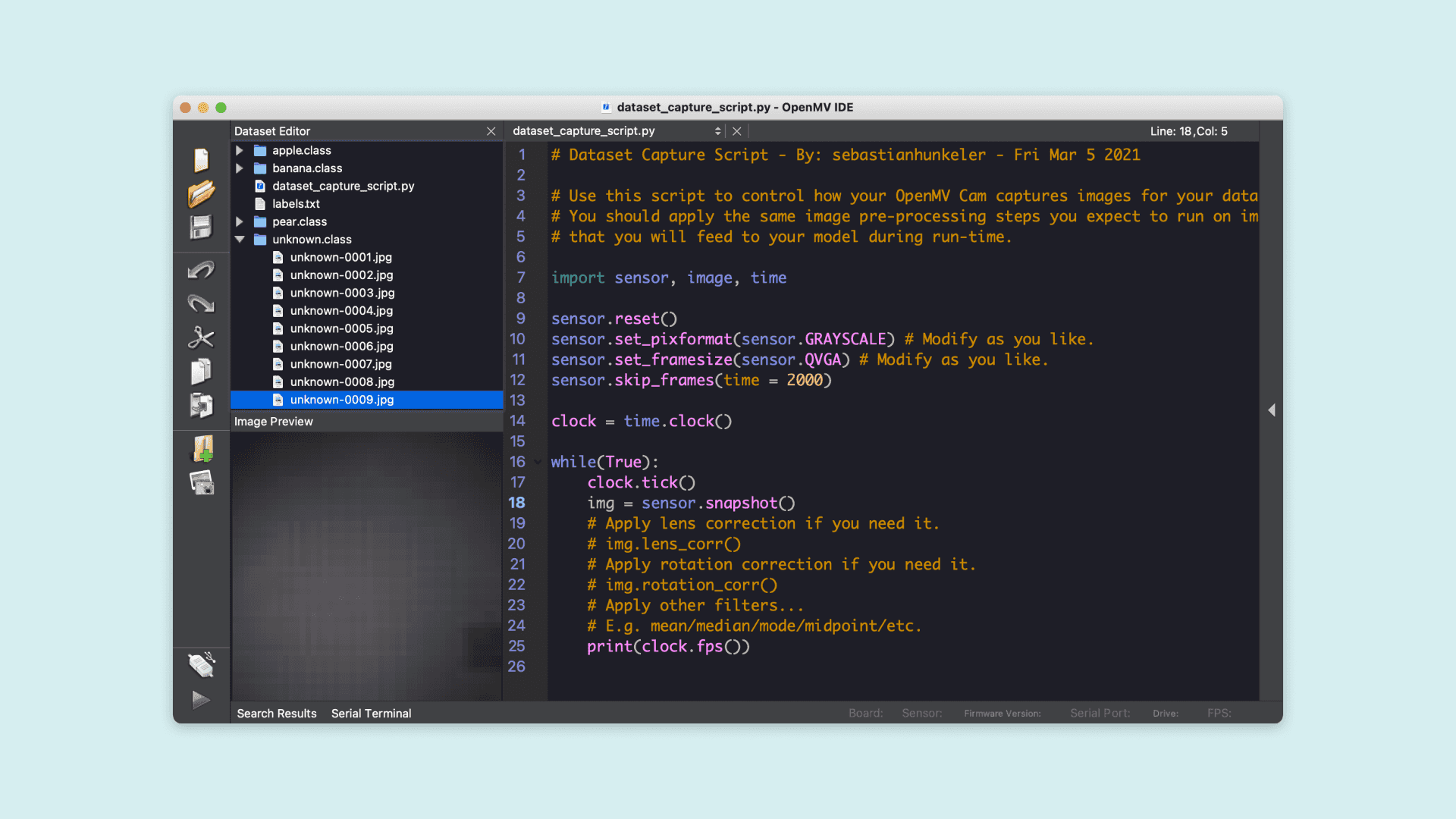 apple by clicking on "New Class Folder" in the toolbar. Now run the image capturing script that is already open by clicking the play button. Focus the apple with the camera and click on Capture Data to snap a picture of it. Capture it from different angles and with different backgrounds to make the recognition more robust later on. Repeat this for other fruits that you would like to classify (e.g. a pear and a banana). Add an unknown class and capture some images of different backgrounds that you would like to use during the classification later on.
