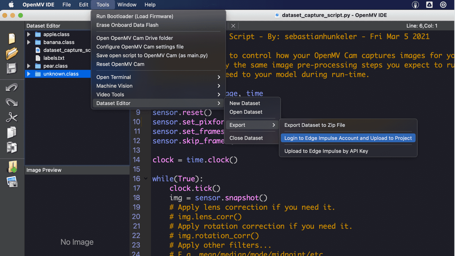 Fruit-Detector.After that, you can go back to the OpenMV IDE and select Tools > Dataset Editor > Export > Log in to Edge Impulse® Account and Upload to Project. The OpenMV IDE will ask you for your Edge Impulse® login credentials. Select the project that you just created and click OK. Leave the data set split setting at the default. This will keep 20% of the images aside for testing the model once it has been trained. That allows you to assess how well your model performs at detecting the objects with data that it has not seen yet.
