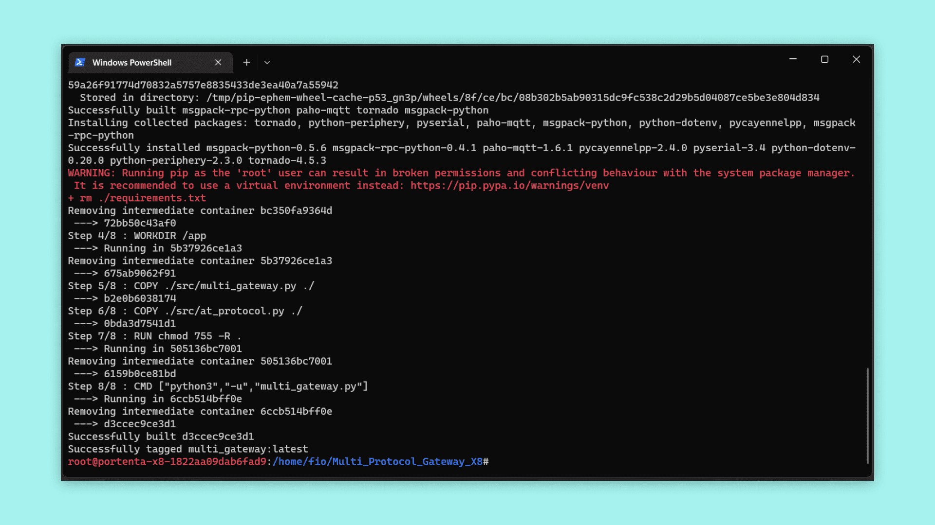 Multi_Protocol_Gateway_X8 as its name.1cd ../home/fio/Multi_Protocol_Gateway_X82sudo docker build . -t multi_gatewayYou will be able to see the following results when the image is built successfully.