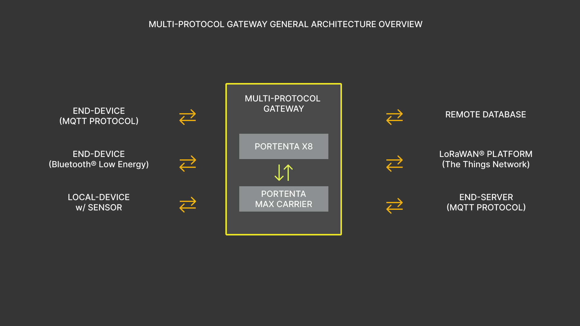 The following image illustrates an architecture overview of a multi-protocol gateway composed of Portenta X8 and Max Carrier as the gateway system.