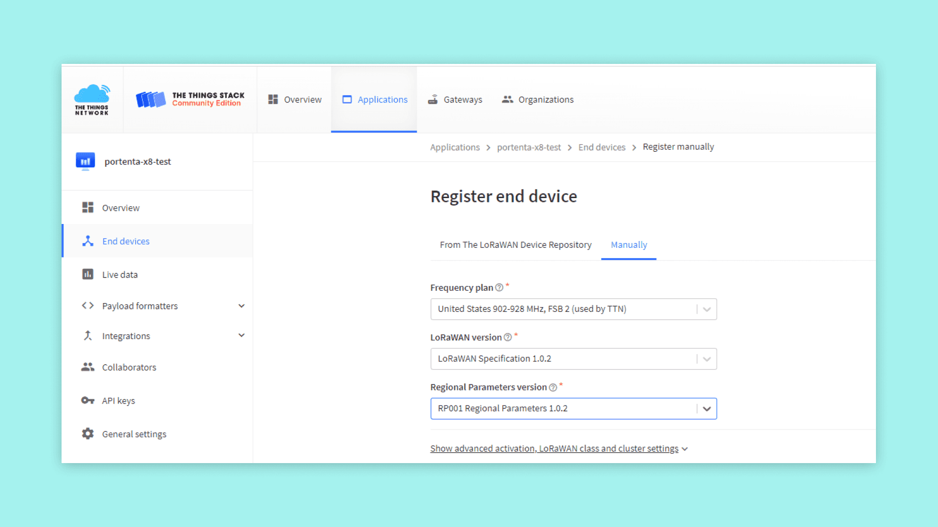 Manual option will be used when adding the End-Device. The Portenta Max Carrier will be added under Arduino SA to be included within the LoRaWAN® Device Repository. The LoRaWAN® version and parameters compatible with the Portenta Max Carrier are as follows. The frequency plan will depend on the region in which you are going to install the device.