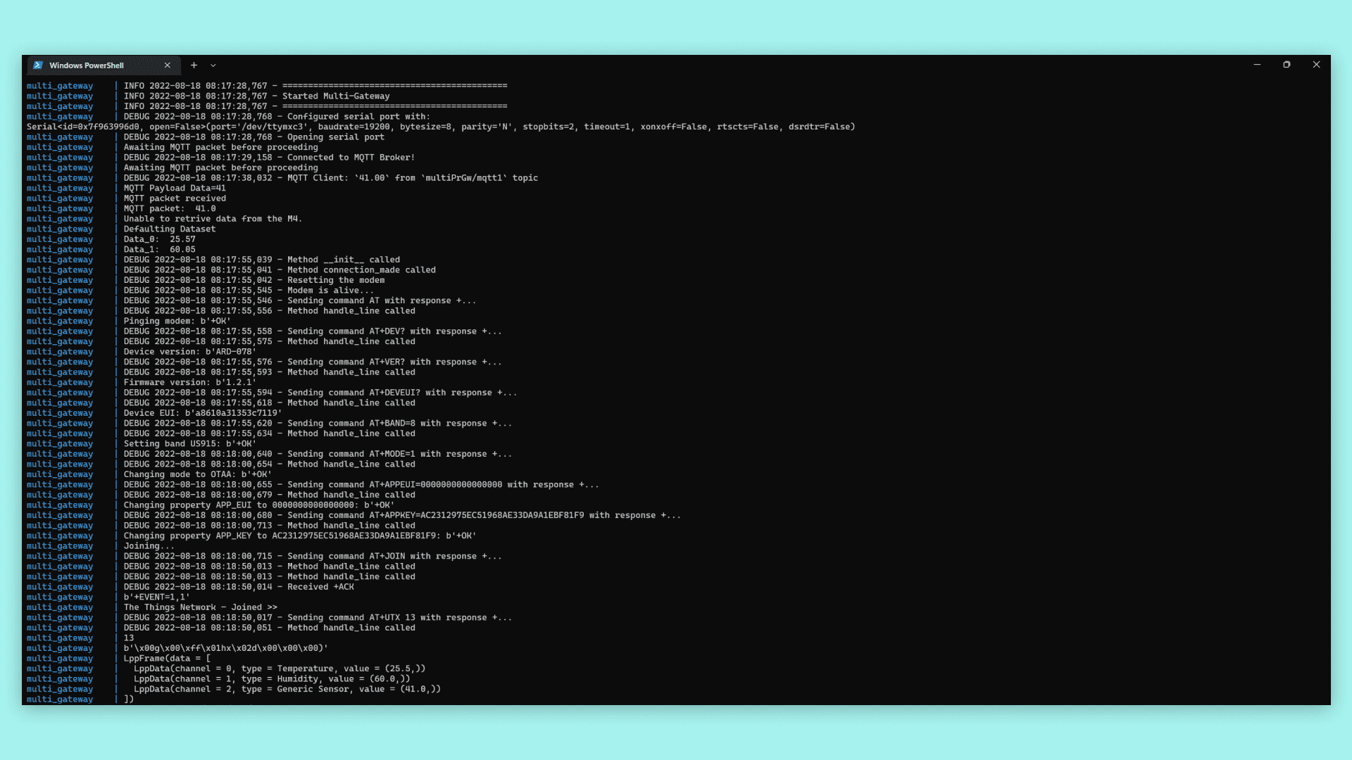 If you are curious about what to expect from the build you have made in this tutorial, the following image shows you the terminal of the running multi-protocol gateway.