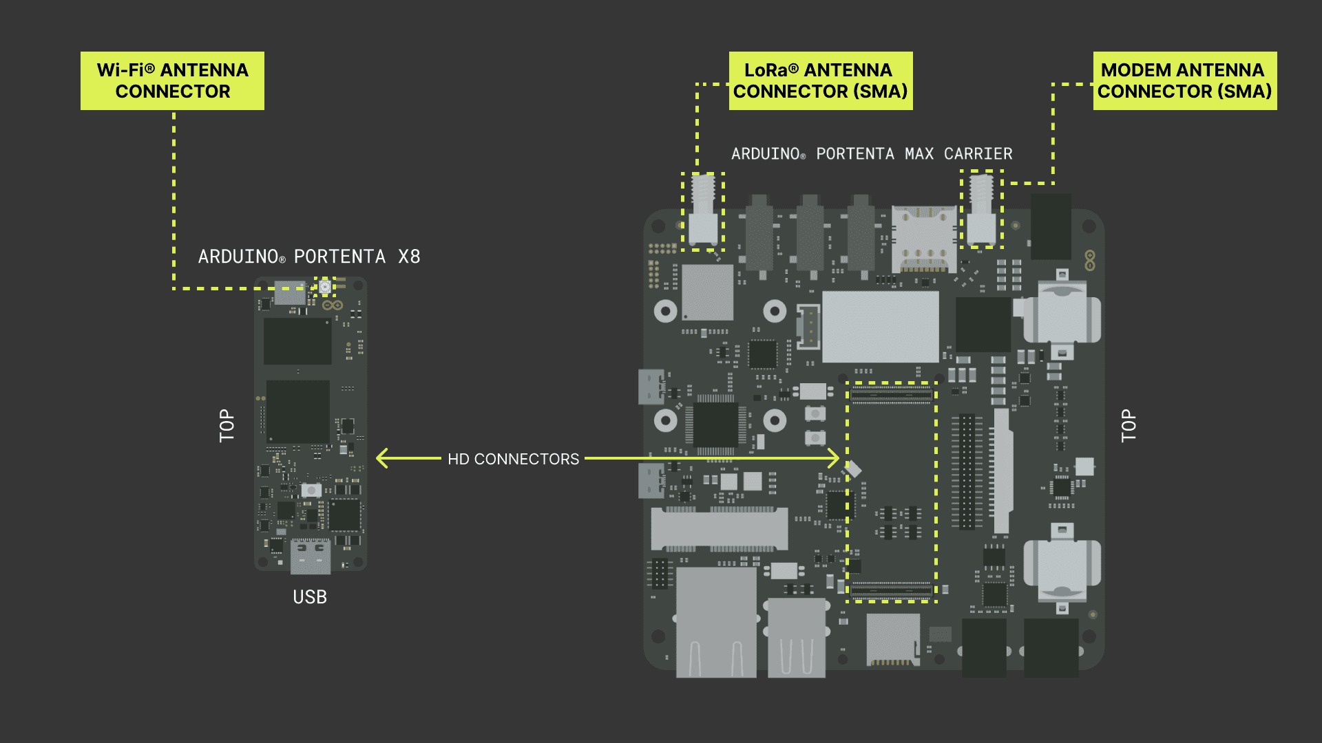 Before setting up the software, it is necessary to configure the hardware to be able to develop and work on the Multi-Protocol gateway. Attach the Portenta X8 to the Portenta Max Carrier High-Density Connectors and be sure to attach an antenna for LoRa® connectivity to the Portenta Max Carrier. The Portenta X8 also needs to have the Wi-Fi® antenna attached to it.