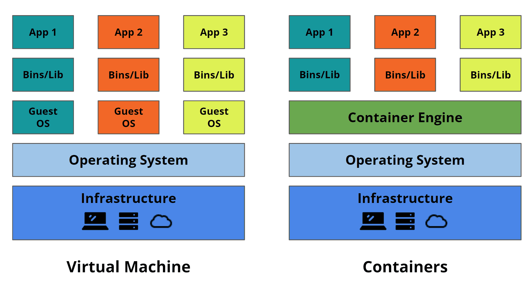 Traditional virtual machines share hardware resources, but the operating system and applications are on the host. This translates into long start-up times (it takes minutes) and considerable use of resources (several Gigabytes). Containers, on the other hand, share the operating system as well as the infrastructure with the host. This means that start-up times are short (a few seconds) and dimensions are significantly reduced (even a few KB).