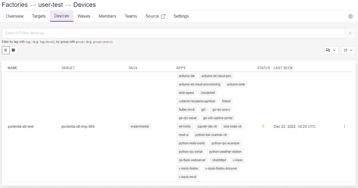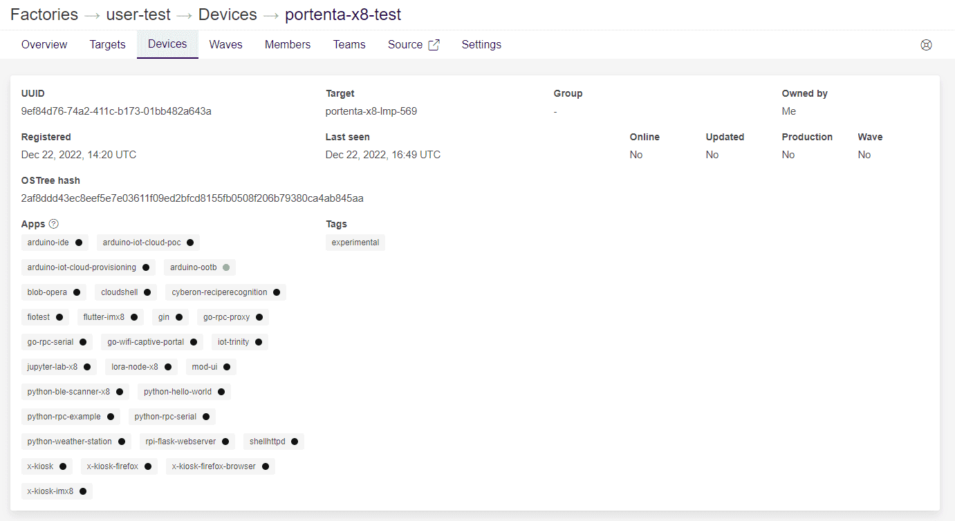 You can see the Target uploaded on your device under the Target column, i.e. portenta-x8-lmp-569, and get additional information about what is included in this specific Target by clicking on it.