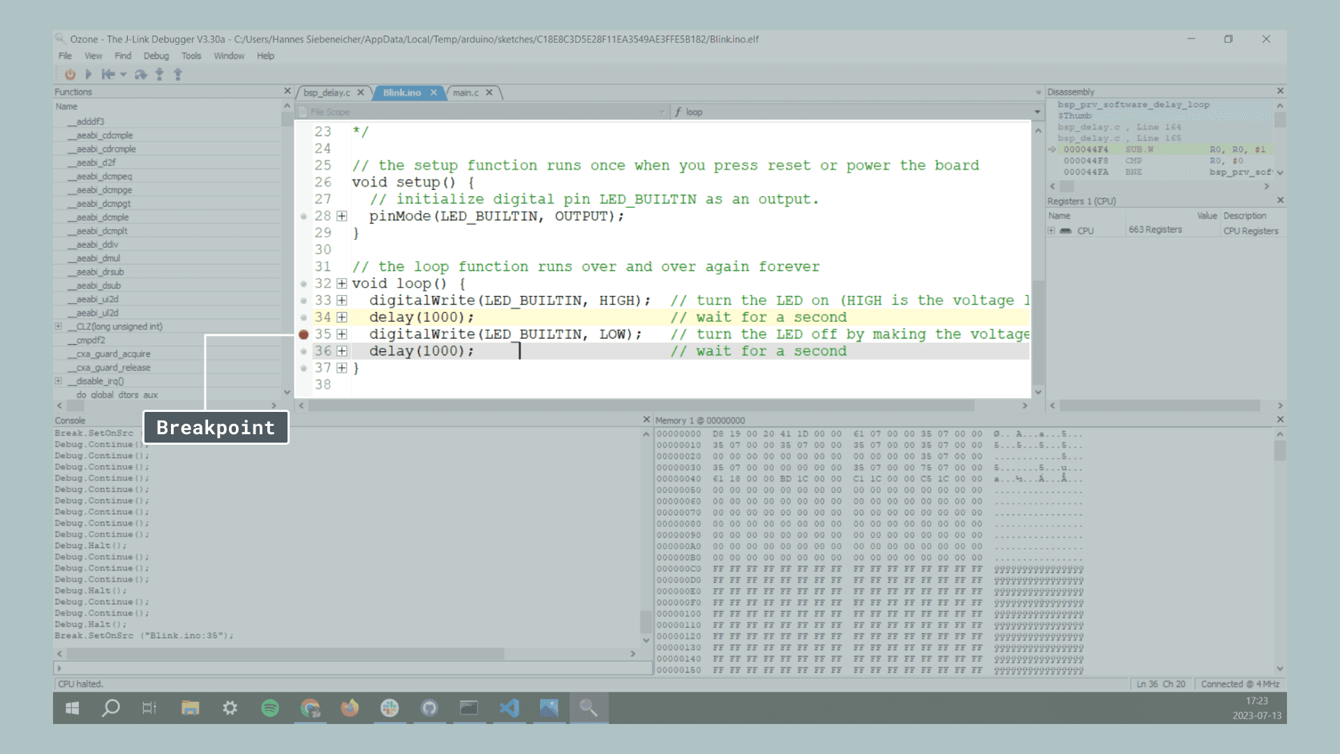 In addition to the necessary hardware we also need some software allowing us to set breakpoints in our code. A breakpoint is an intentional stopping or pausing place at a specific point in the code, allowing you to read values at that exact point. In this case, we will be using Ozone which is a software developed by Segger®. It’s a graphical debugger for embedded applications and we can use it to set breakpoints, read out memory addresses, and read the value of any variable at a specific point in time.